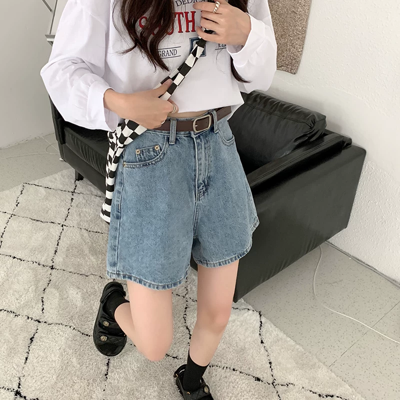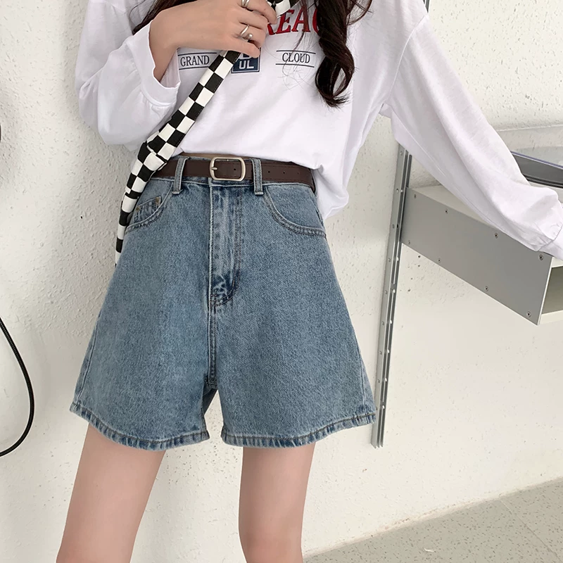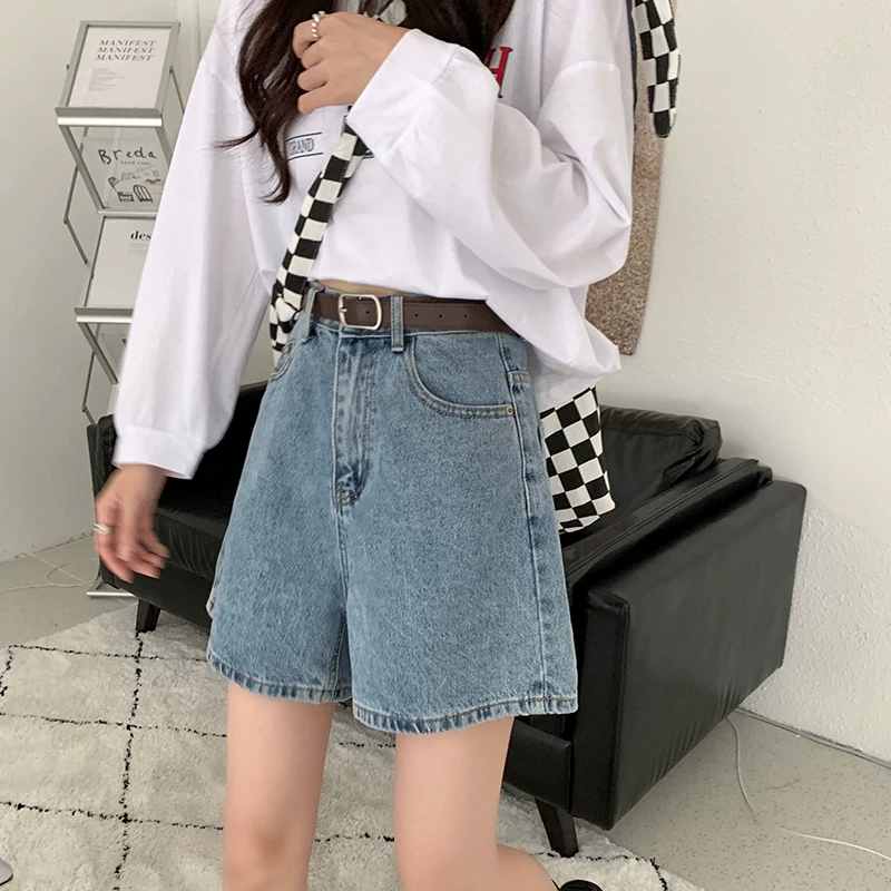 - Quần short denim màu xanh nhạt hình quả lê dành cho nữ, quần ống rộng dáng chữ A cạp cao, dáng rộng, tôn dáng, mùa hè, size lớn