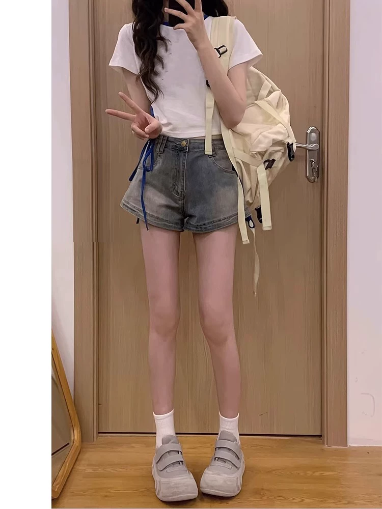 - Quần short denim nữ cho mùa hè, cỡ lớn, phong cách cổ điển Mỹ, quần short hot girl, cạp cao, co giãn, che hông, quần short chữ A giảm béo