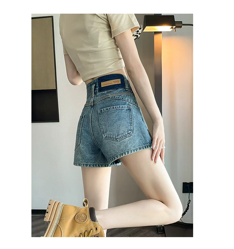 Quần short denim nữ cho mùa hè, kiểu dáng mỏng, cỡ lớn, được thiết kế dành cho phụ nữ có đường cong, lưng cao, dáng rộng, giúp bạn trông cao và thon gọn hơn, quần ống rộng kiểu chữ A.