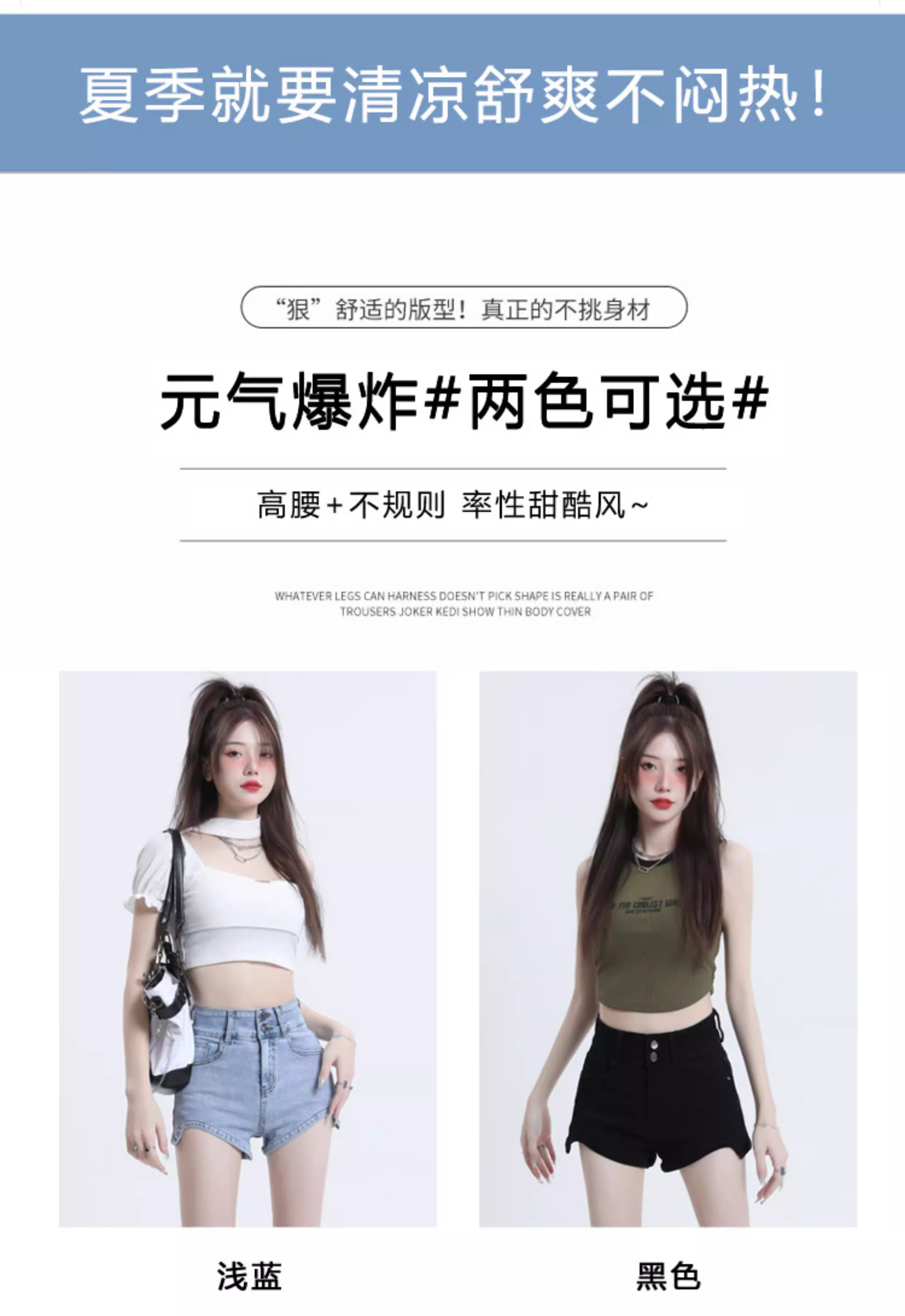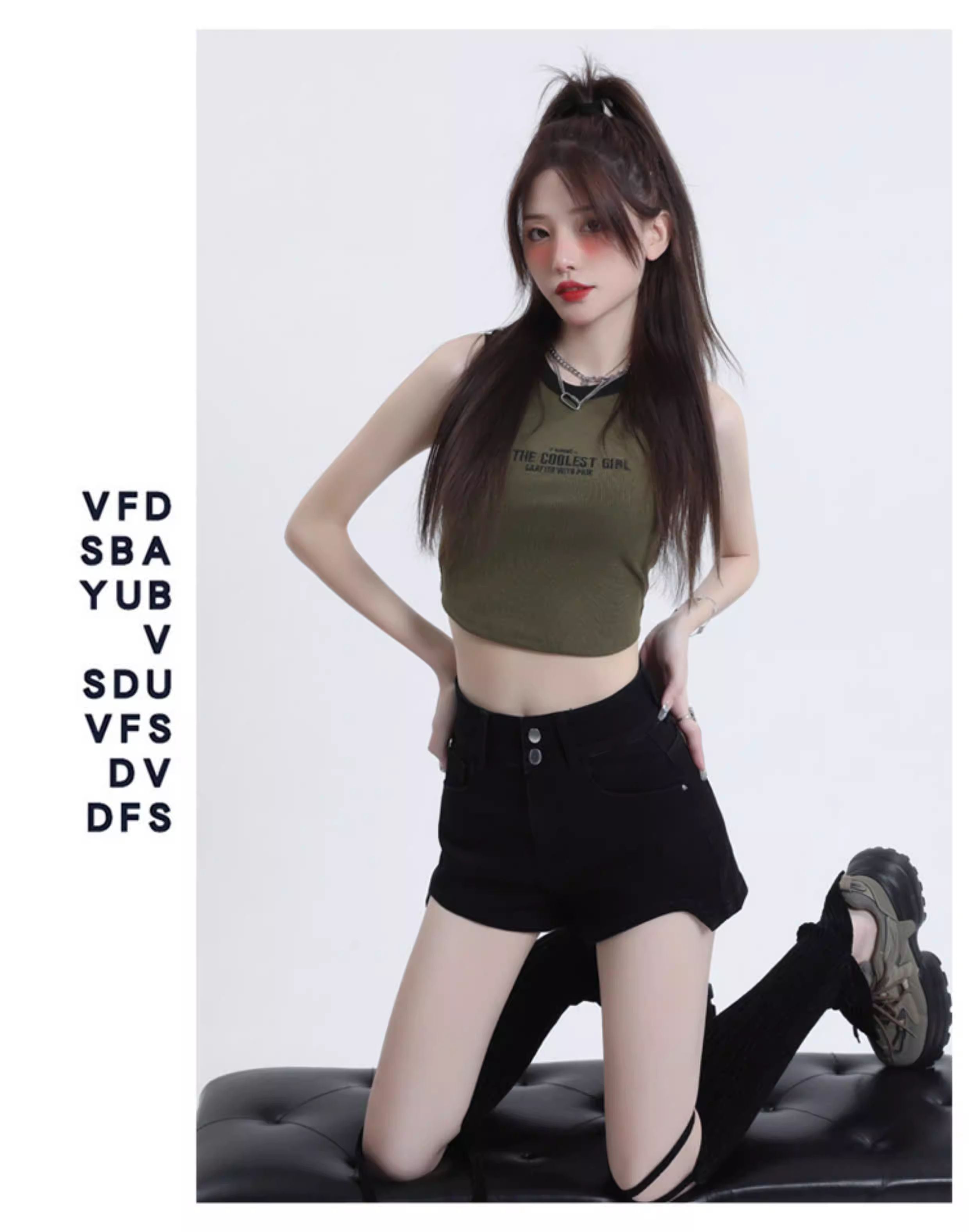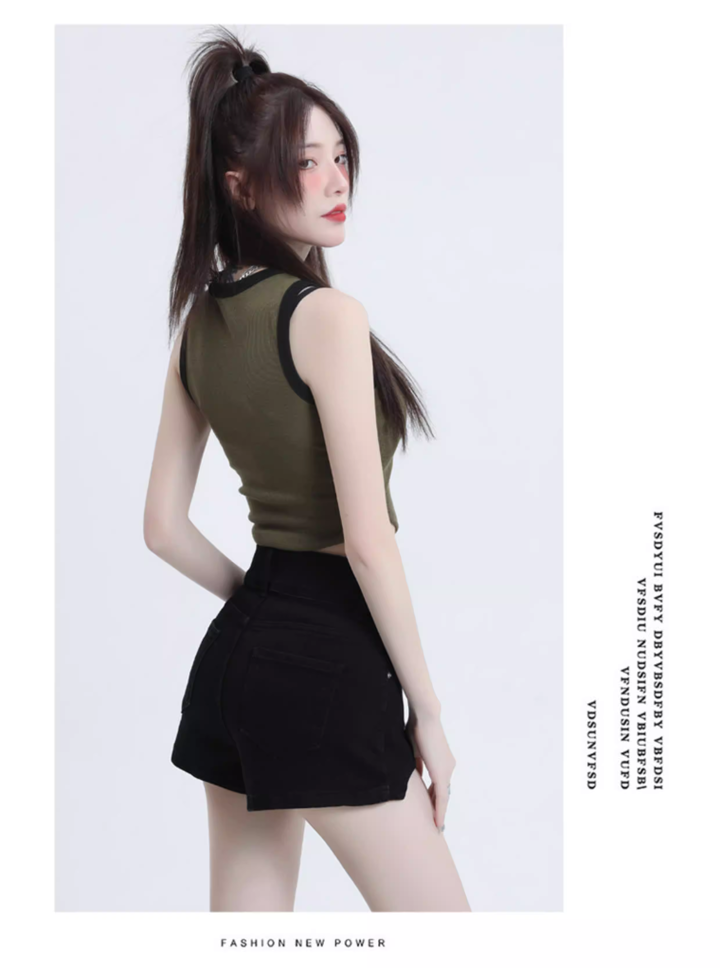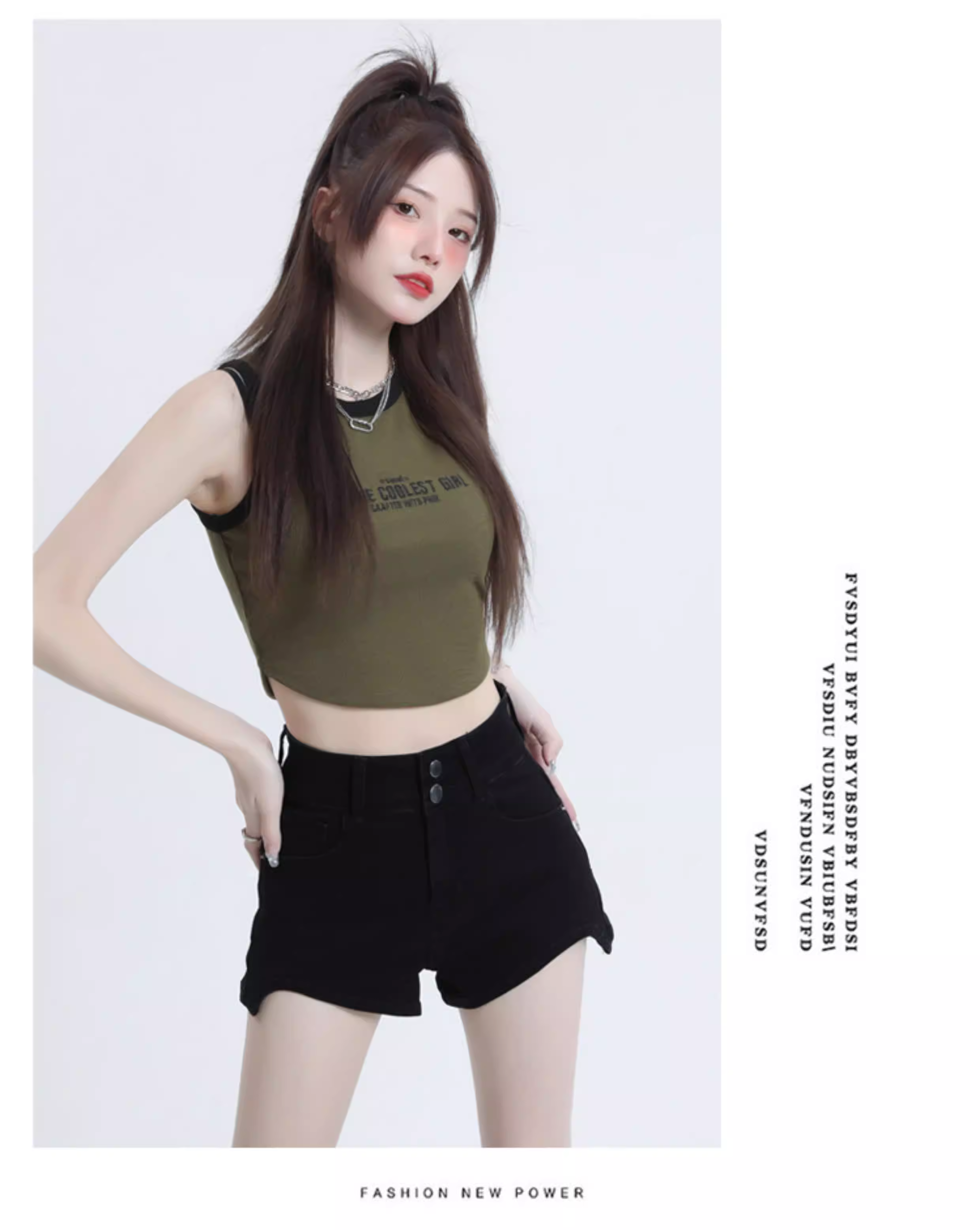 - Quần short denim nữ La Chapelle màu đen, kiểu dáng ôm sát, lưng cao, chất liệu thun co giãn, dáng chữ A, mùa hè 2025.