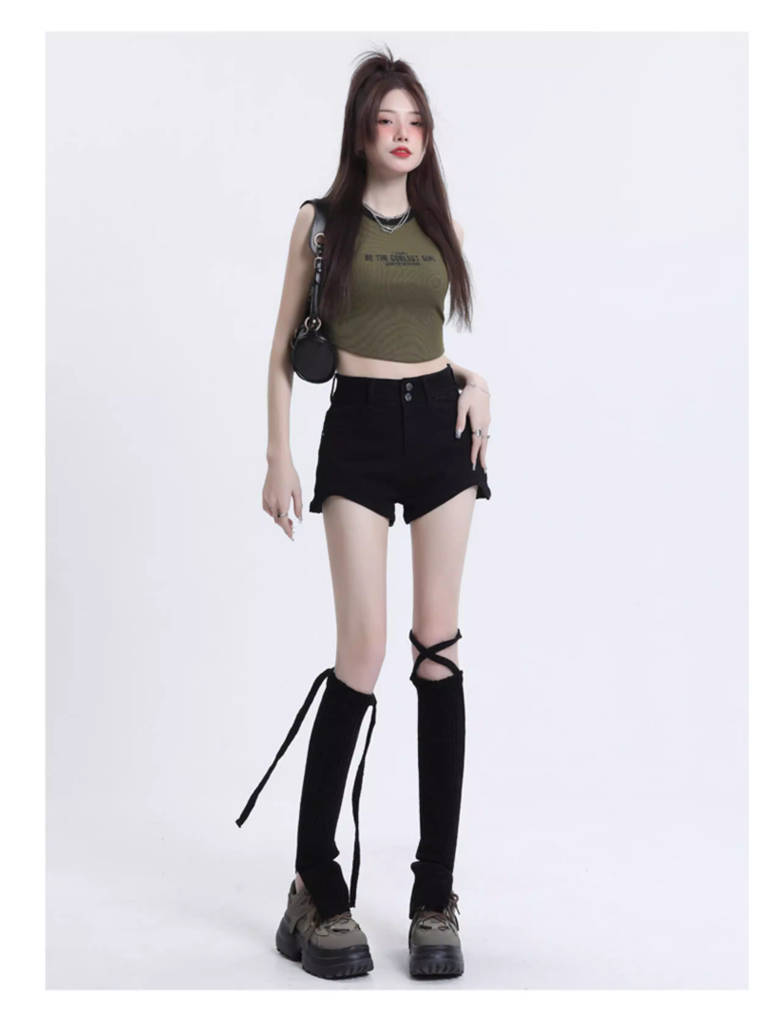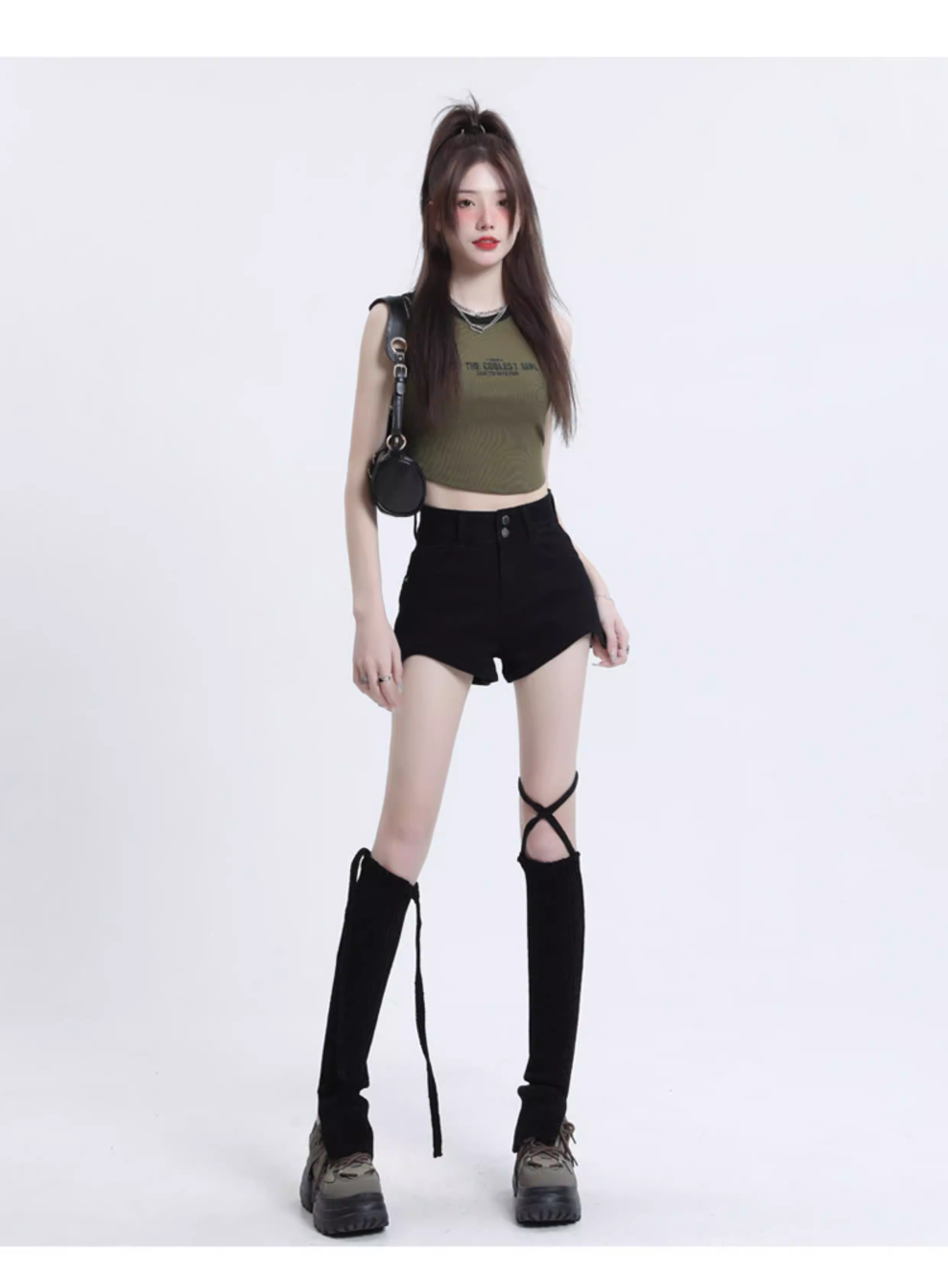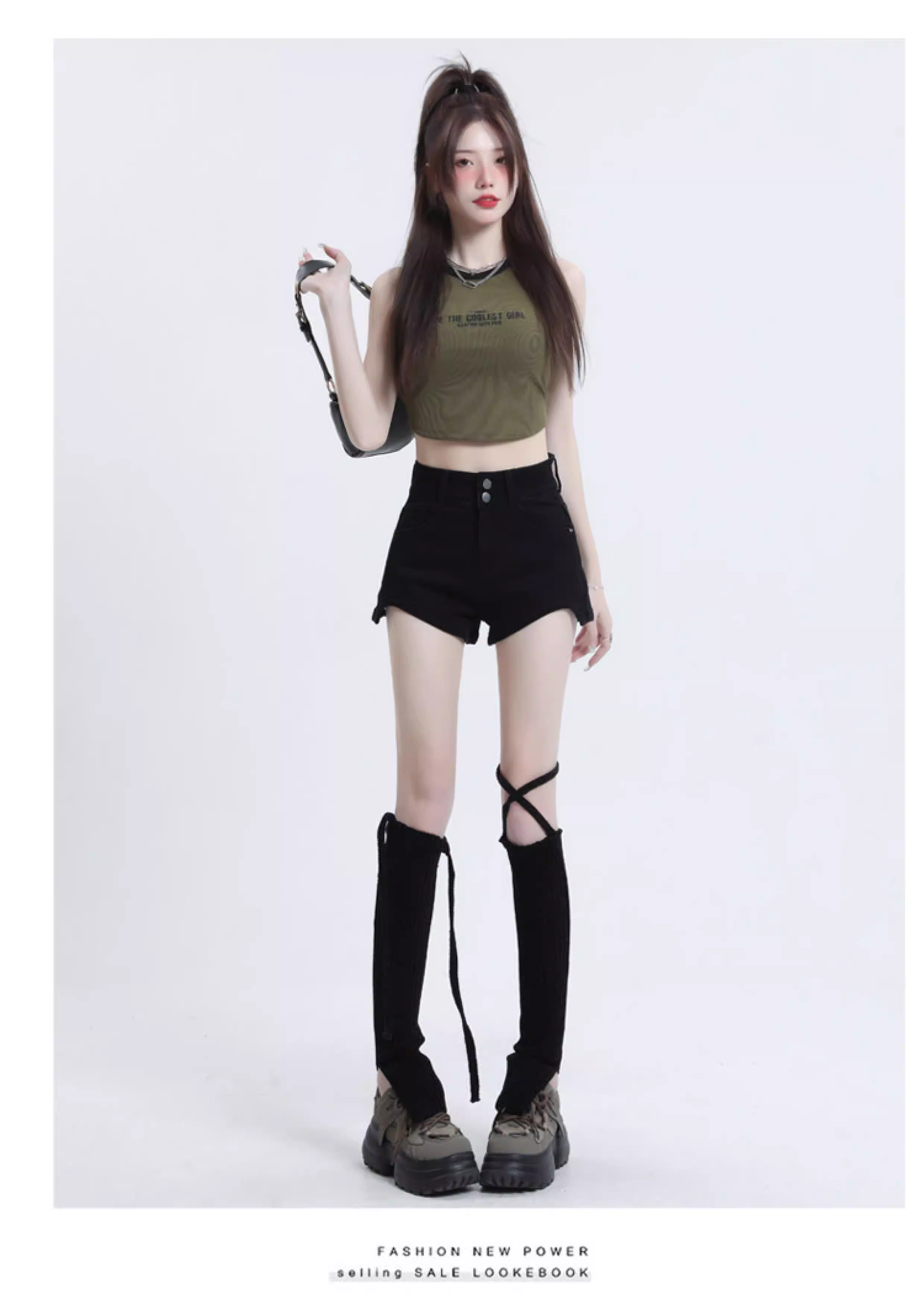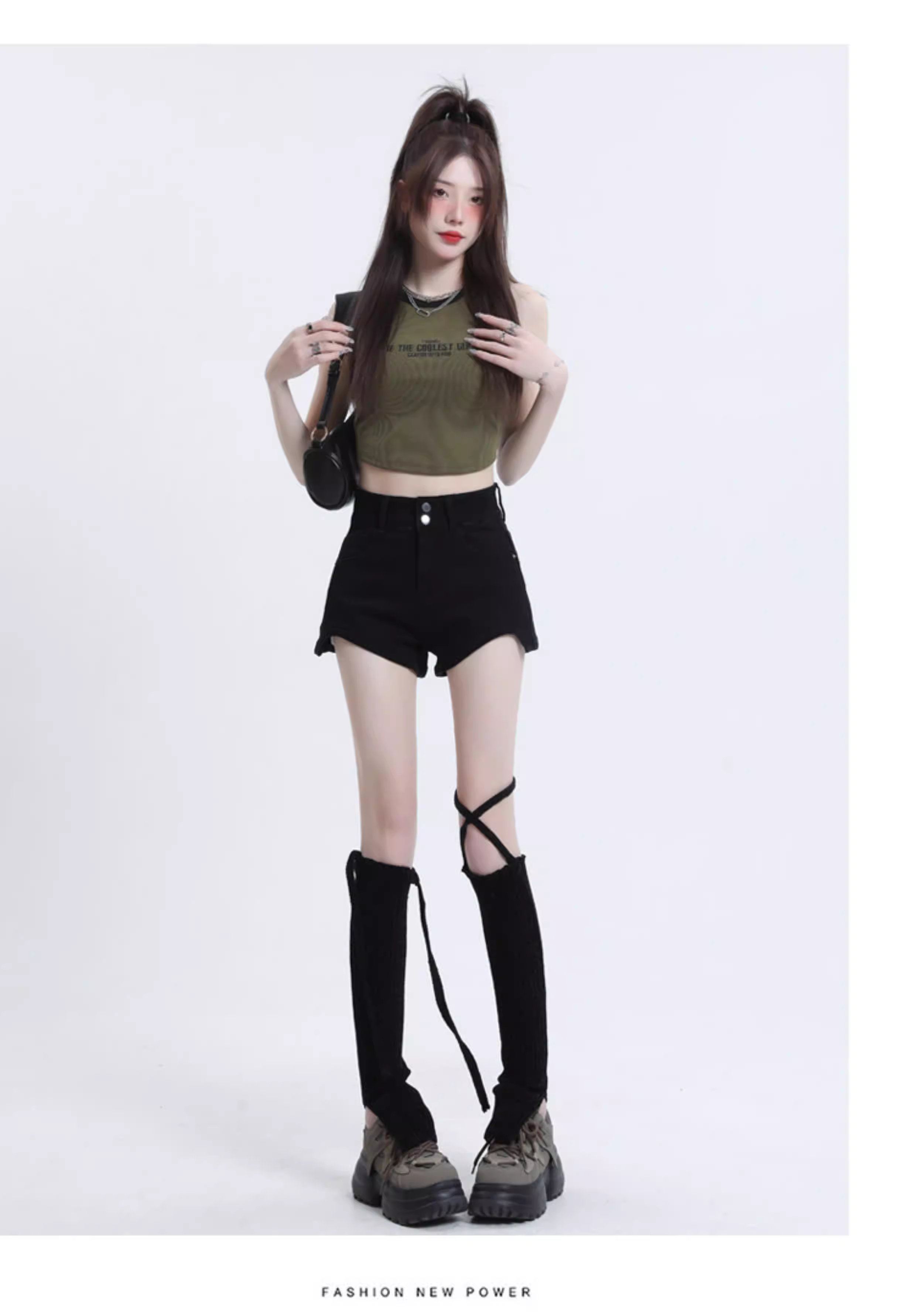 - Quần short denim nữ La Chapelle màu đen, kiểu dáng ôm sát, lưng cao, chất liệu thun co giãn, dáng chữ A, mùa hè 2025.