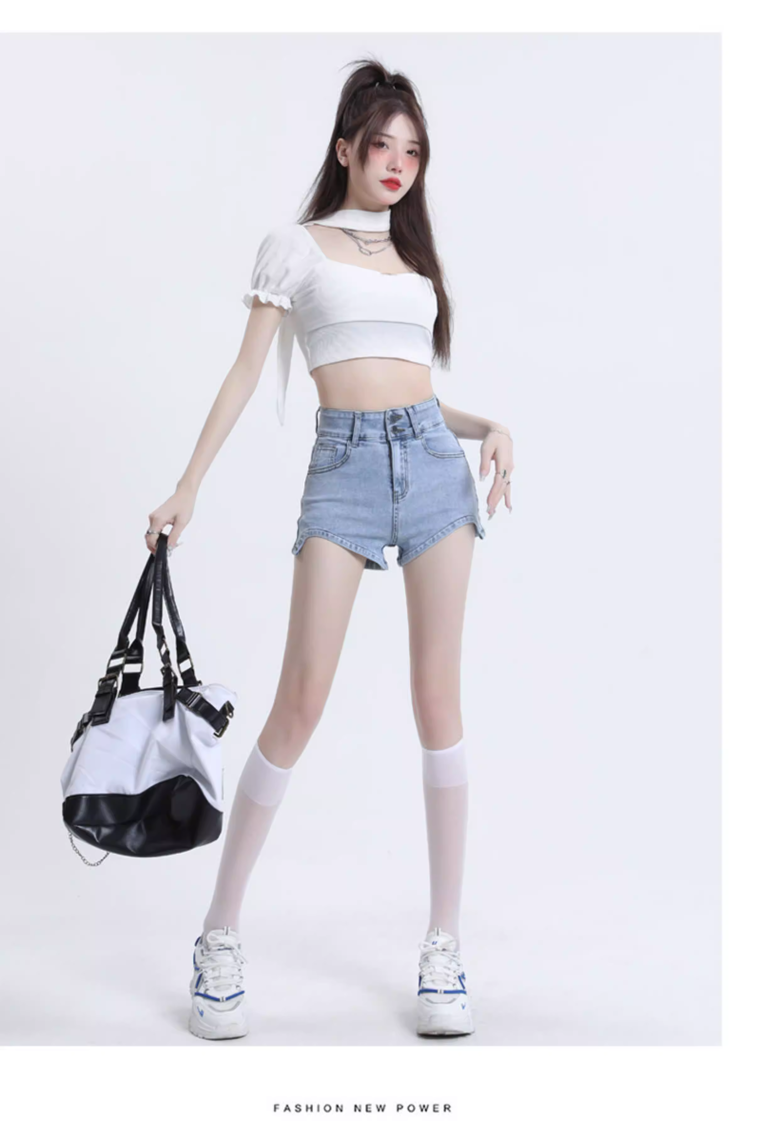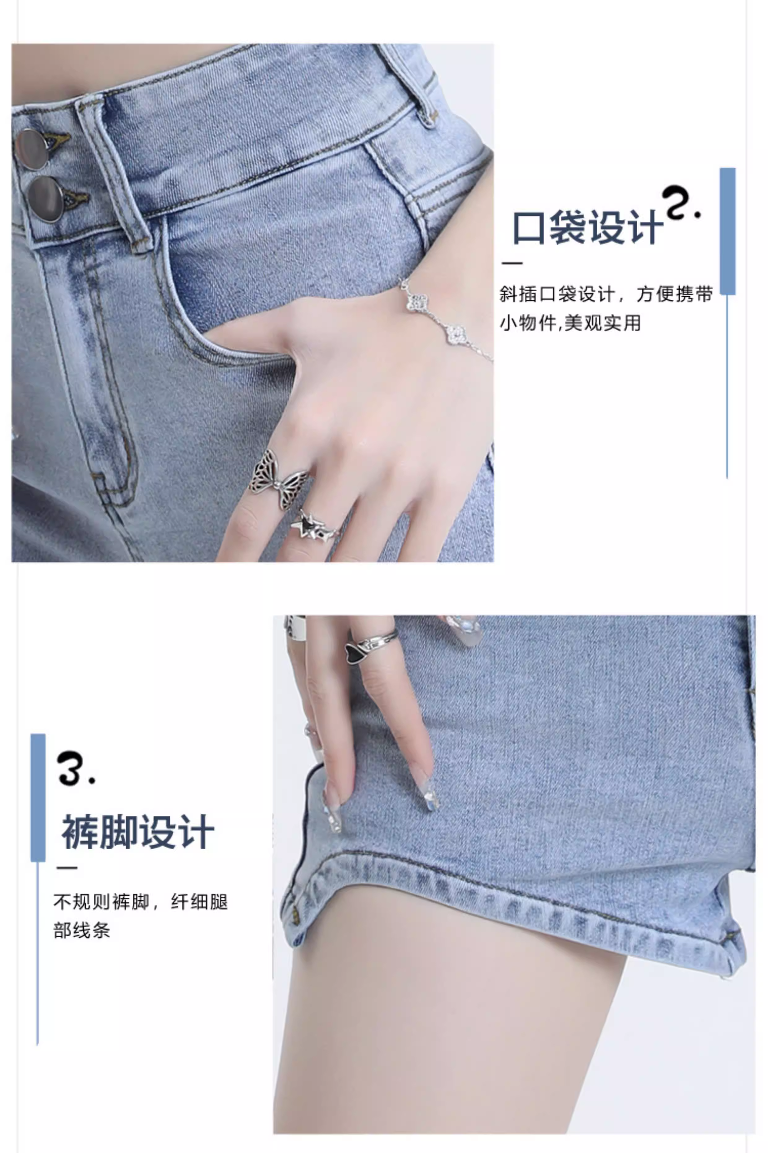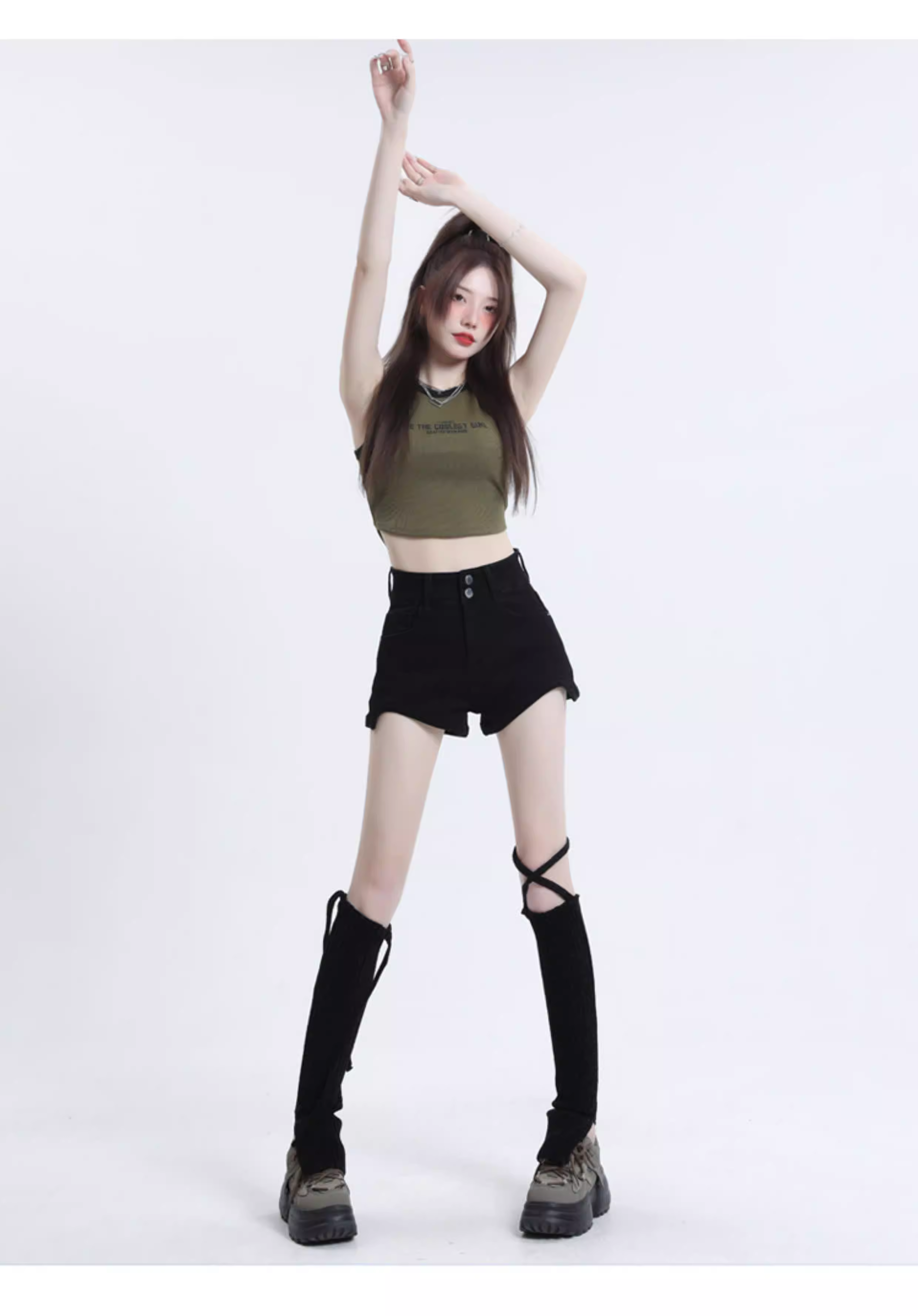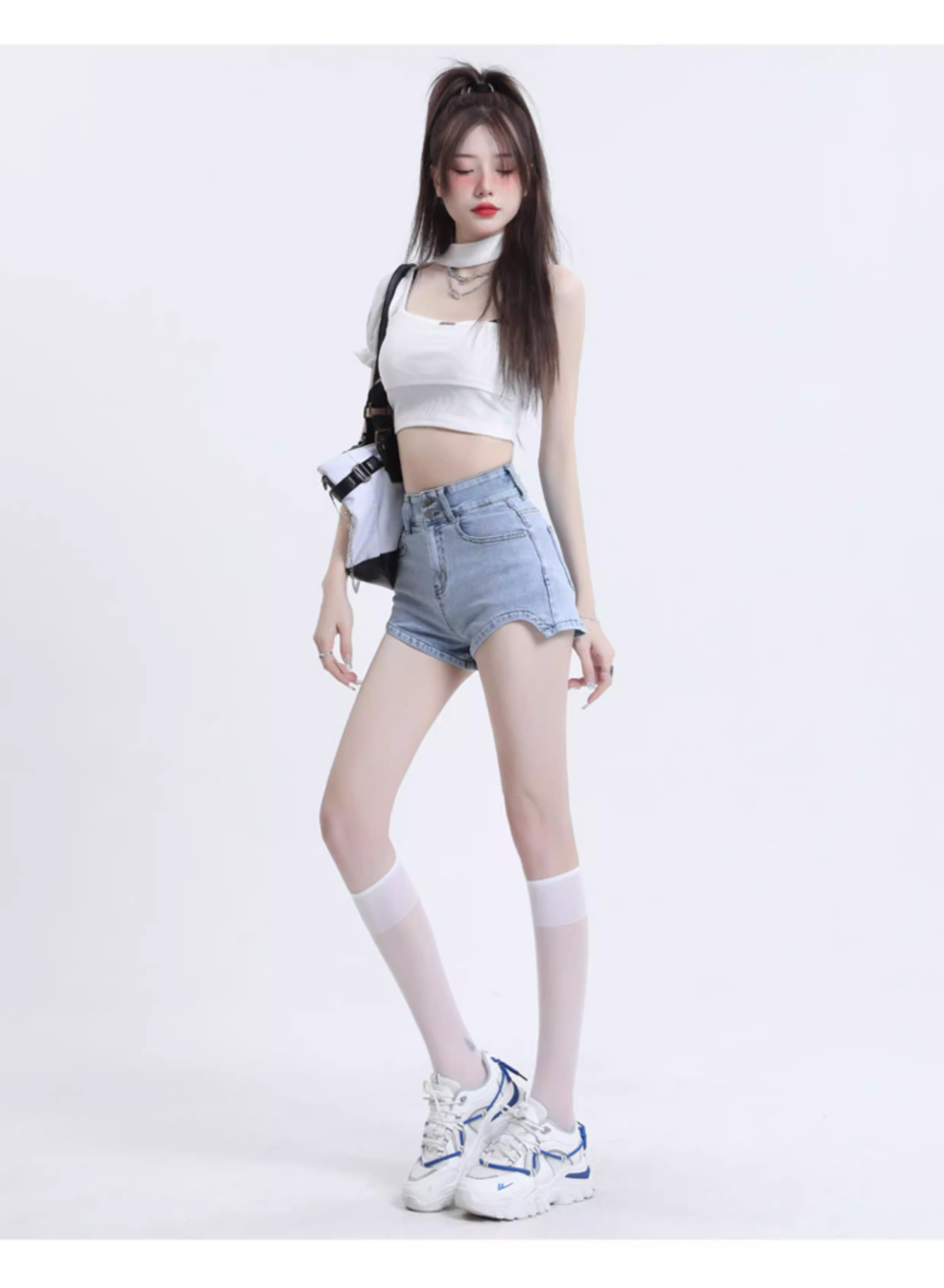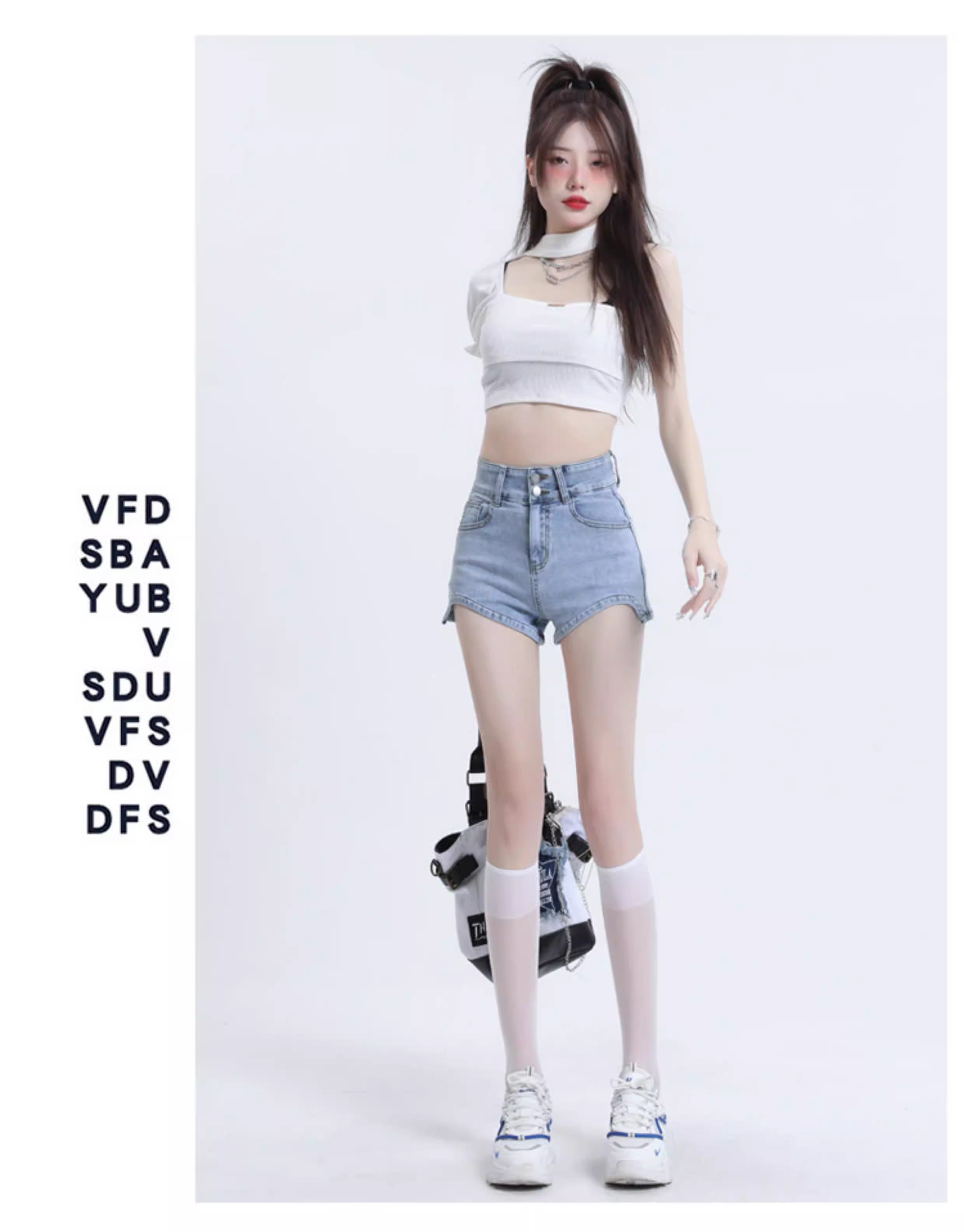 - Quần short denim nữ La Chapelle màu đen, kiểu dáng ôm sát, lưng cao, chất liệu thun co giãn, dáng chữ A, mùa hè 2025.
