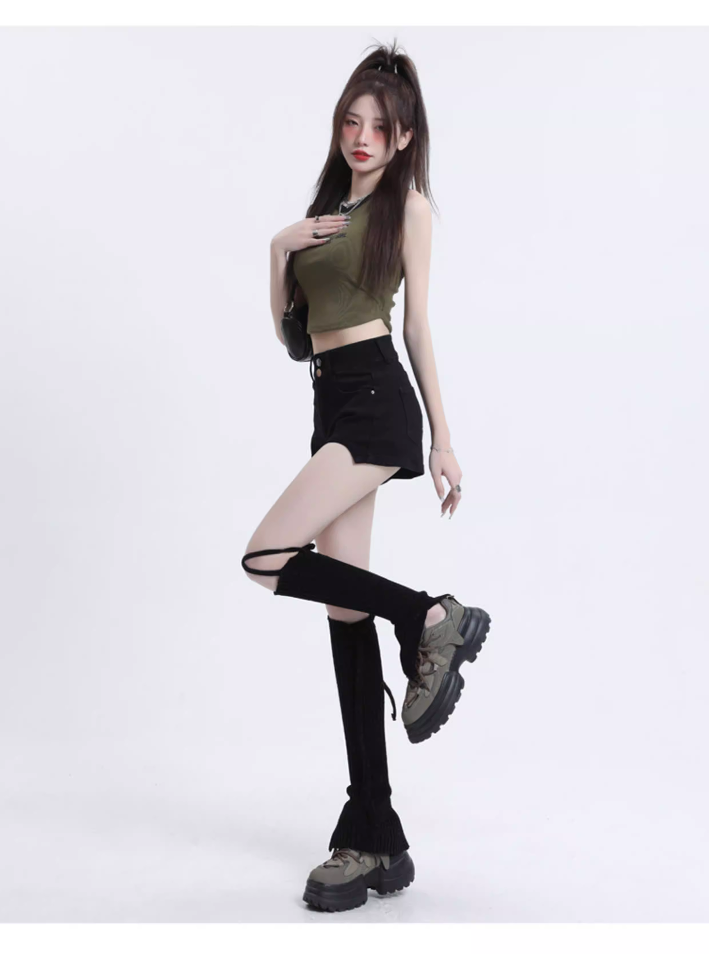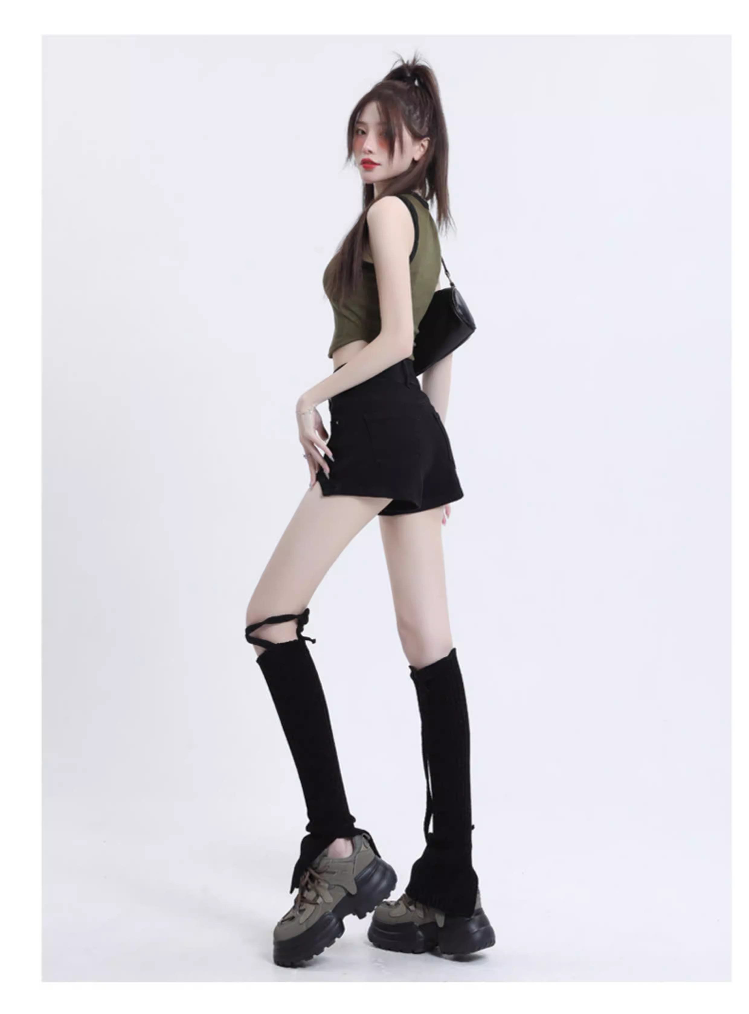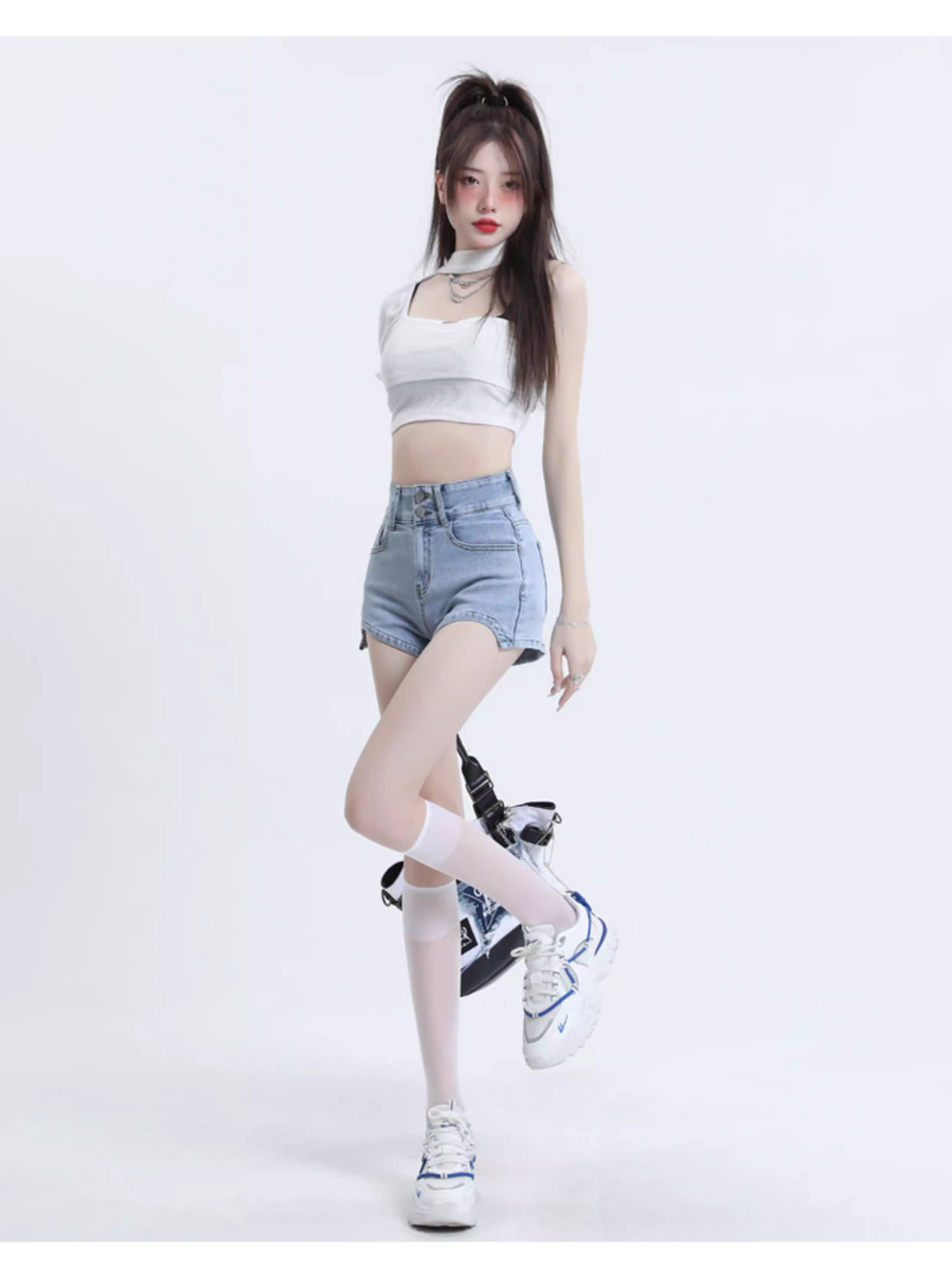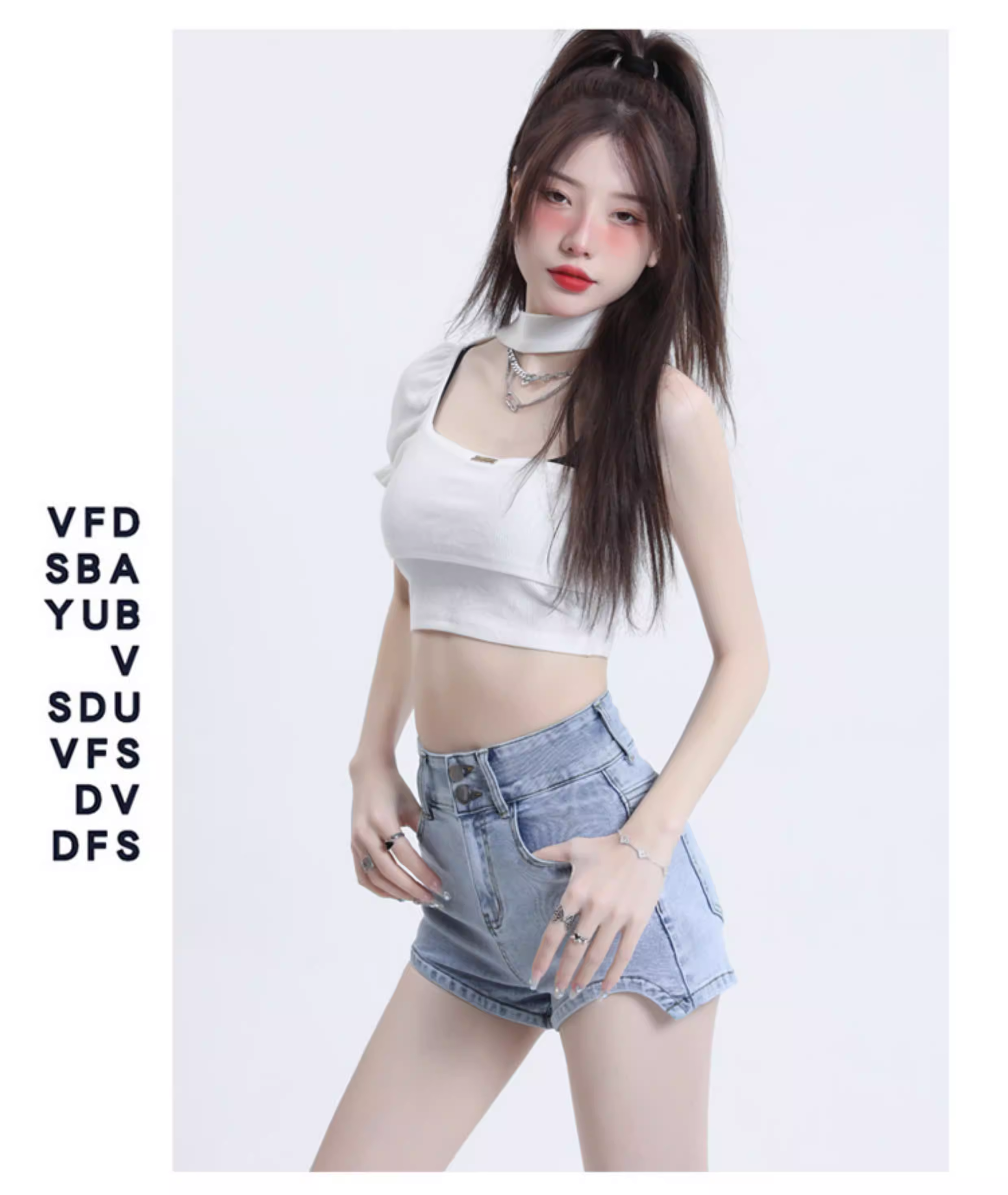 - Quần short denim nữ La Chapelle màu đen, kiểu dáng ôm sát, lưng cao, chất liệu thun co giãn, dáng chữ A, mùa hè 2025.