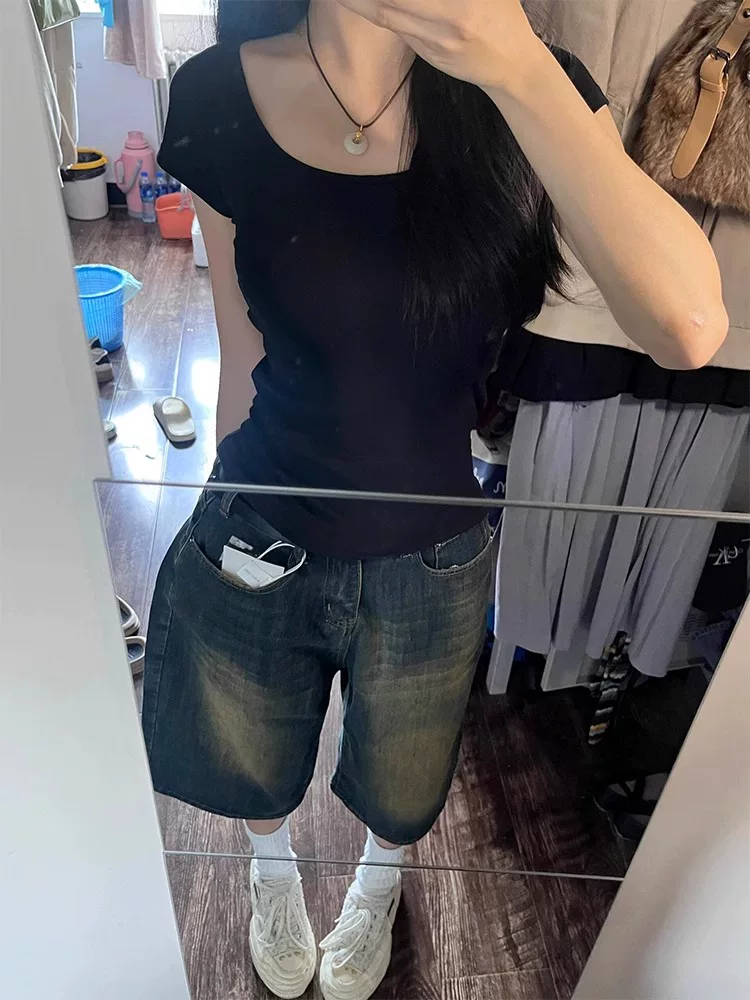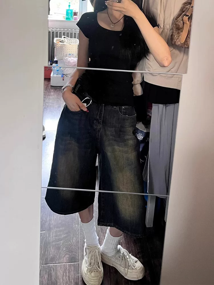 - Quần short denim ống đứng cổ điển dành cho nữ, kiểu mới hè 2025, size lớn, cạp cao, rộng rãi, tôn dáng, ống rộng, quần lửng.