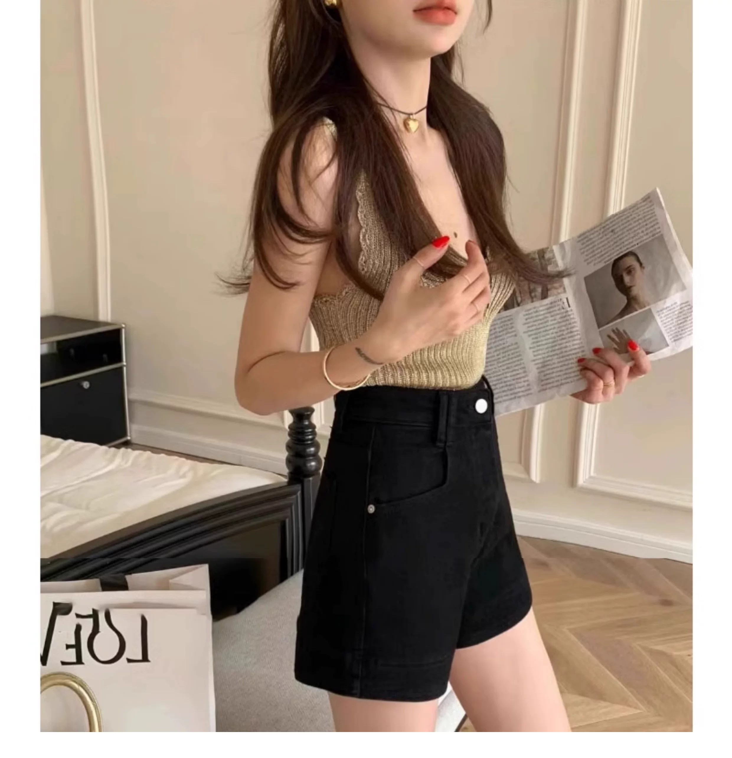 - Quần short denim ống đứng màu đen dành cho nữ, cỡ lớn mùa hè, cạp cao, co giãn, che hông, giảm béo, quần ống rộng chữ A đa năng.