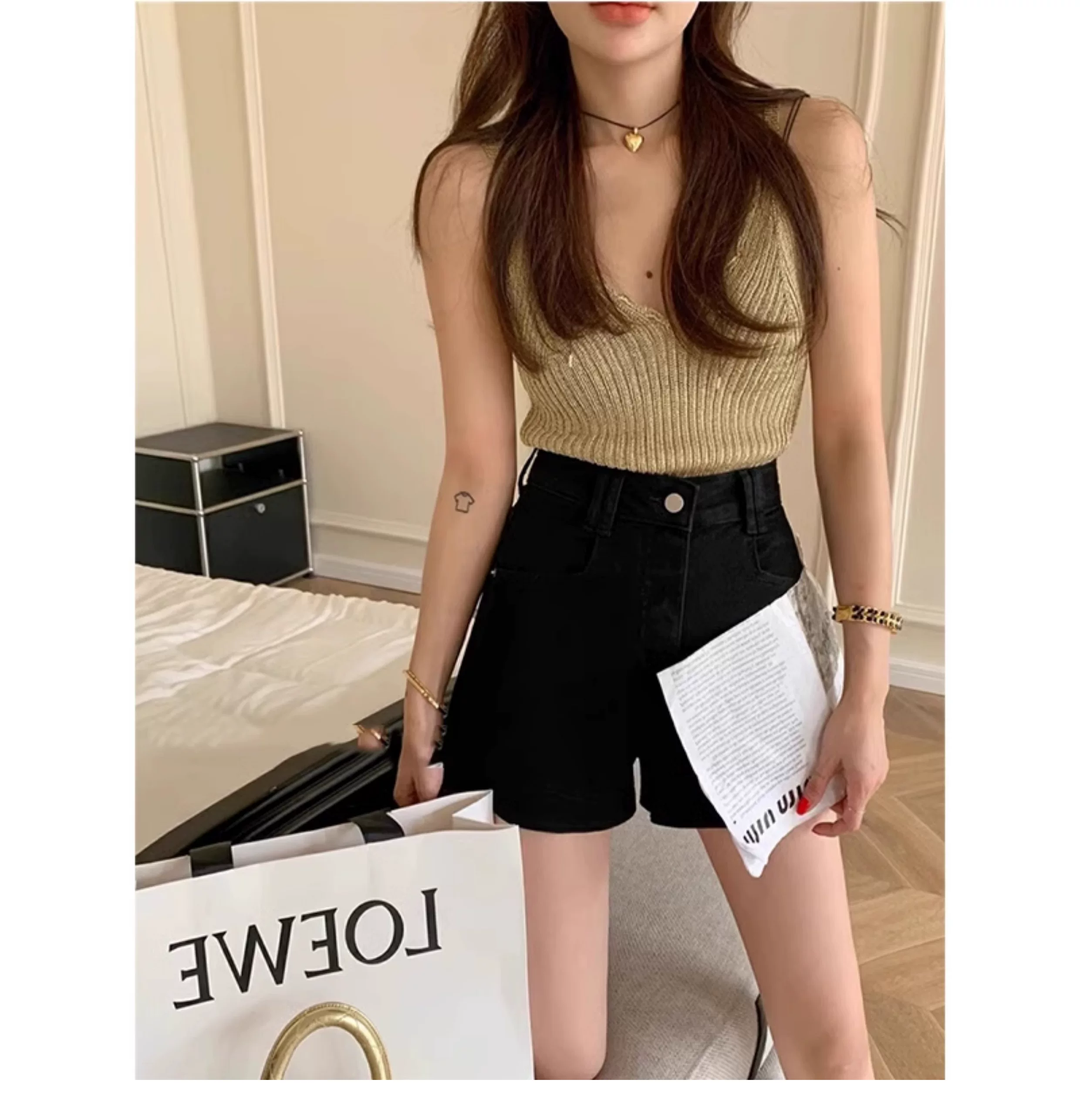 Quần short denim ống đứng màu đen dành cho nữ, cỡ lớn mùa hè, cạp cao, co giãn, che hông, giảm béo, quần ống rộng chữ A đa năng.