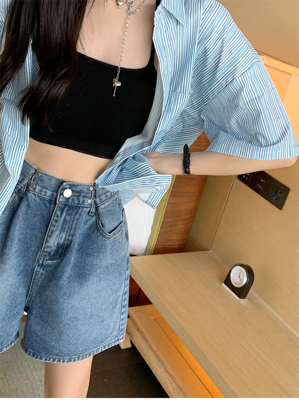 Quần short denim ống rộng dành cho nữ cỡ lớn dành cho mùa hè, kiểu dáng mỏng, dáng quả lê, cỡ lớn, lưng cao, quần ngắn chữ A năm điểm giúp thon gọn.