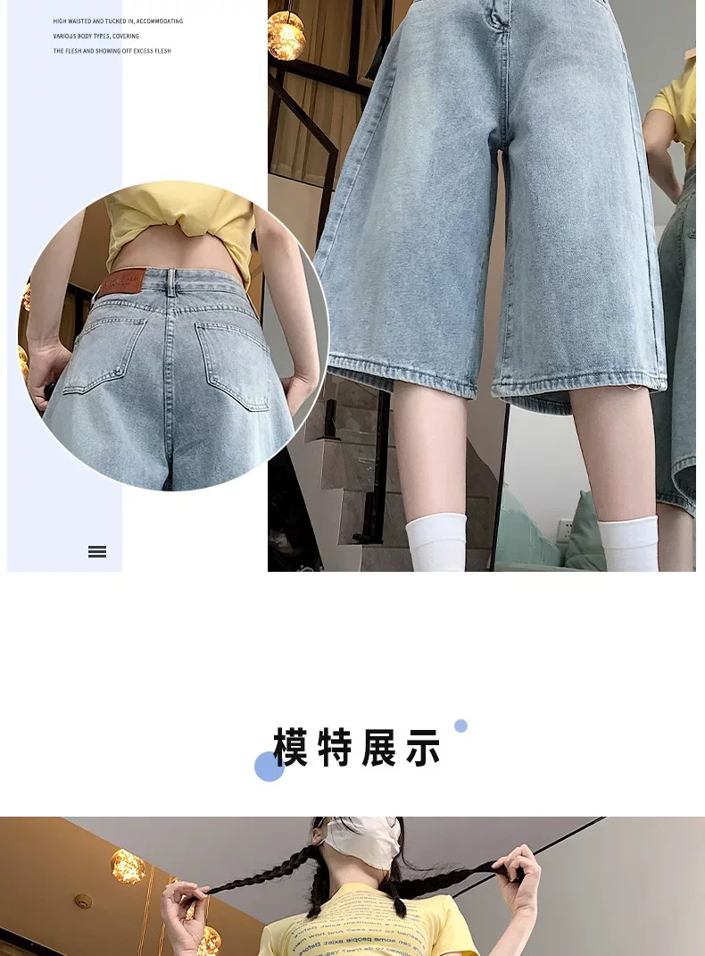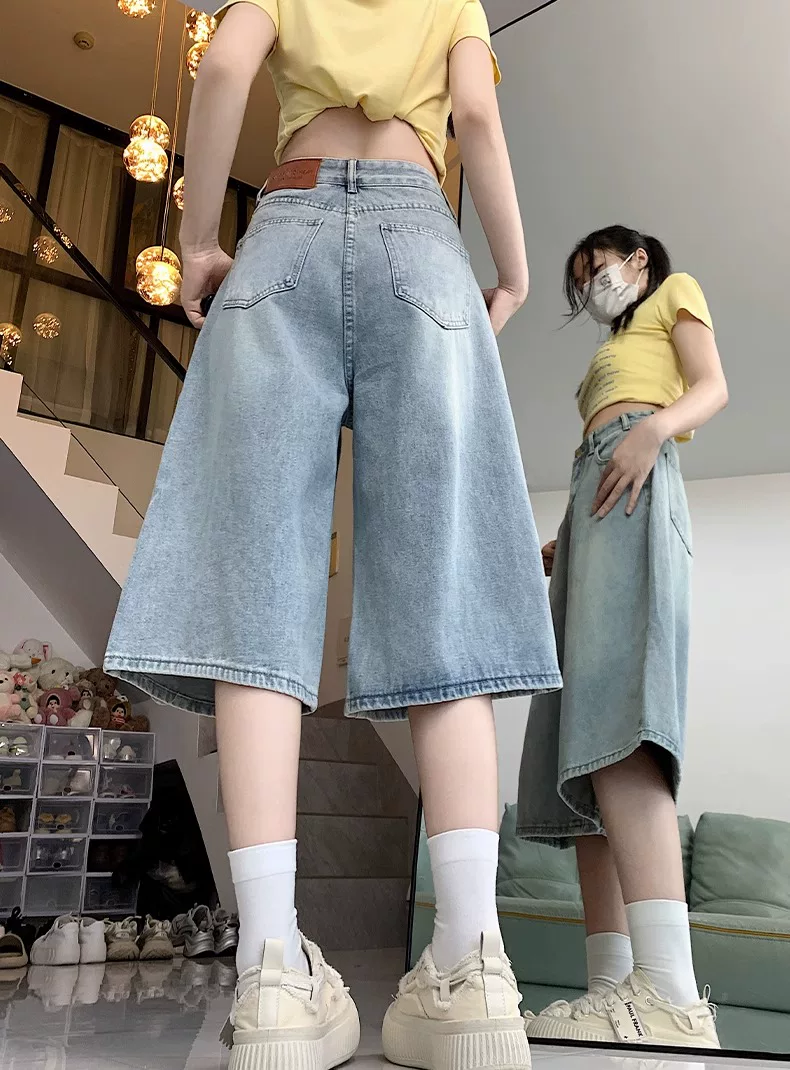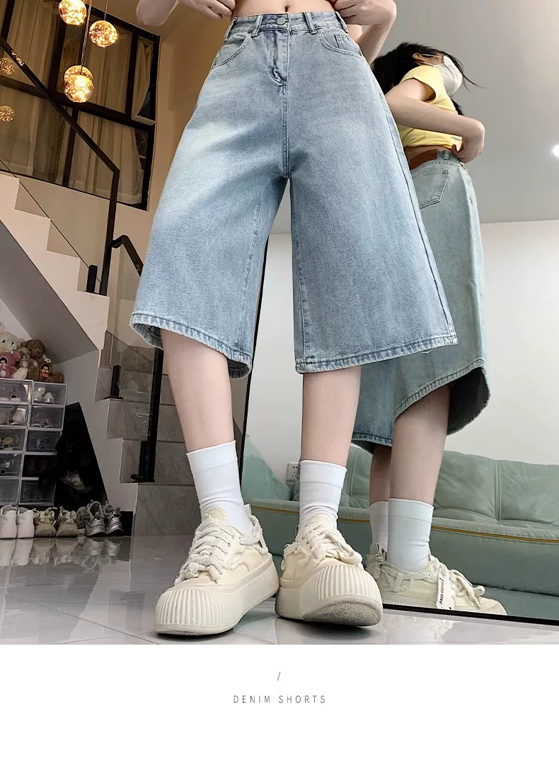 Quần short denim ống rộng, màu sáng, kiểu retro dành cho nữ, mùa hè 2025, size lớn, cạp cao, dáng rộng, tôn dáng, quần ống thẳng.