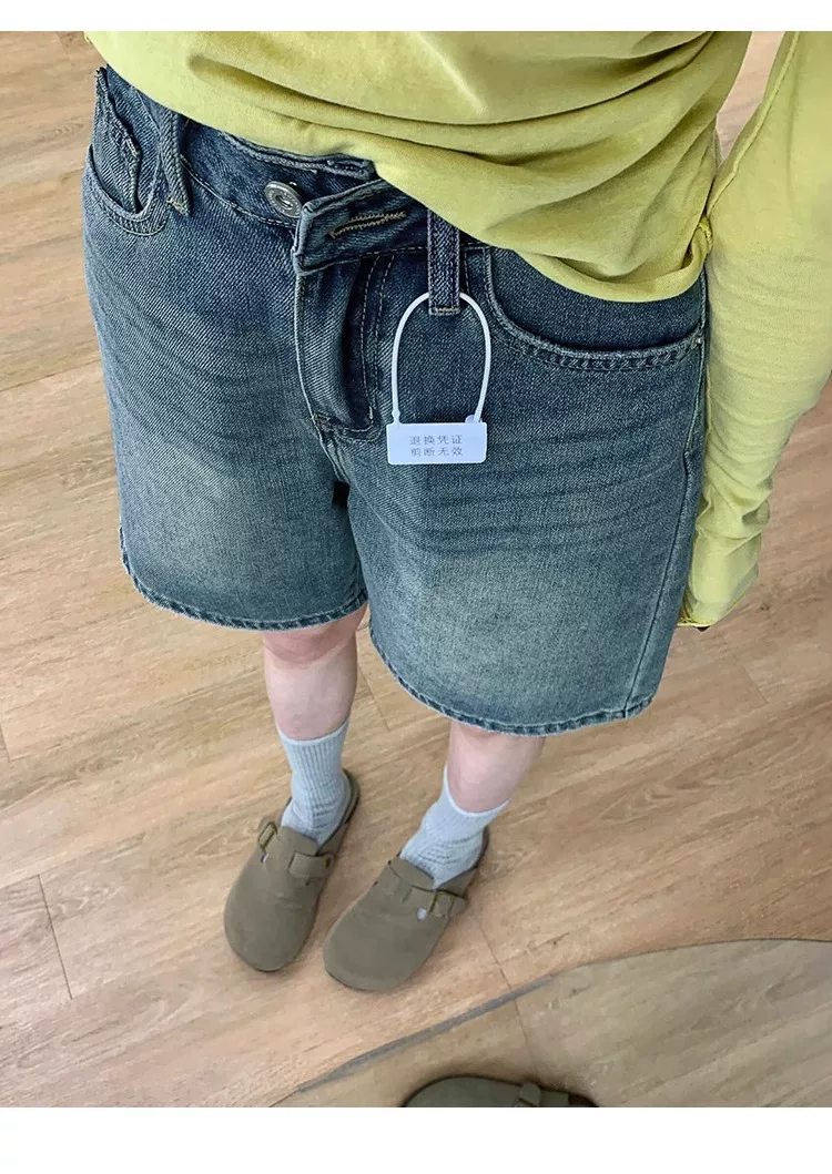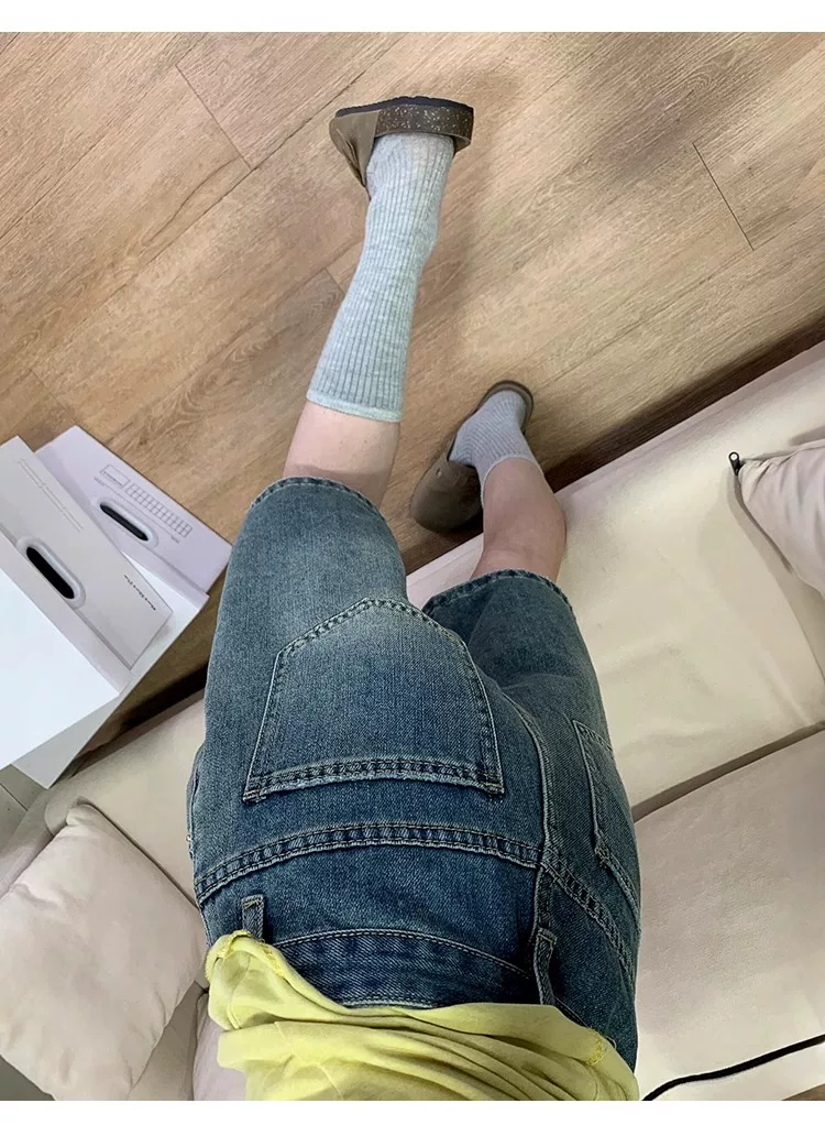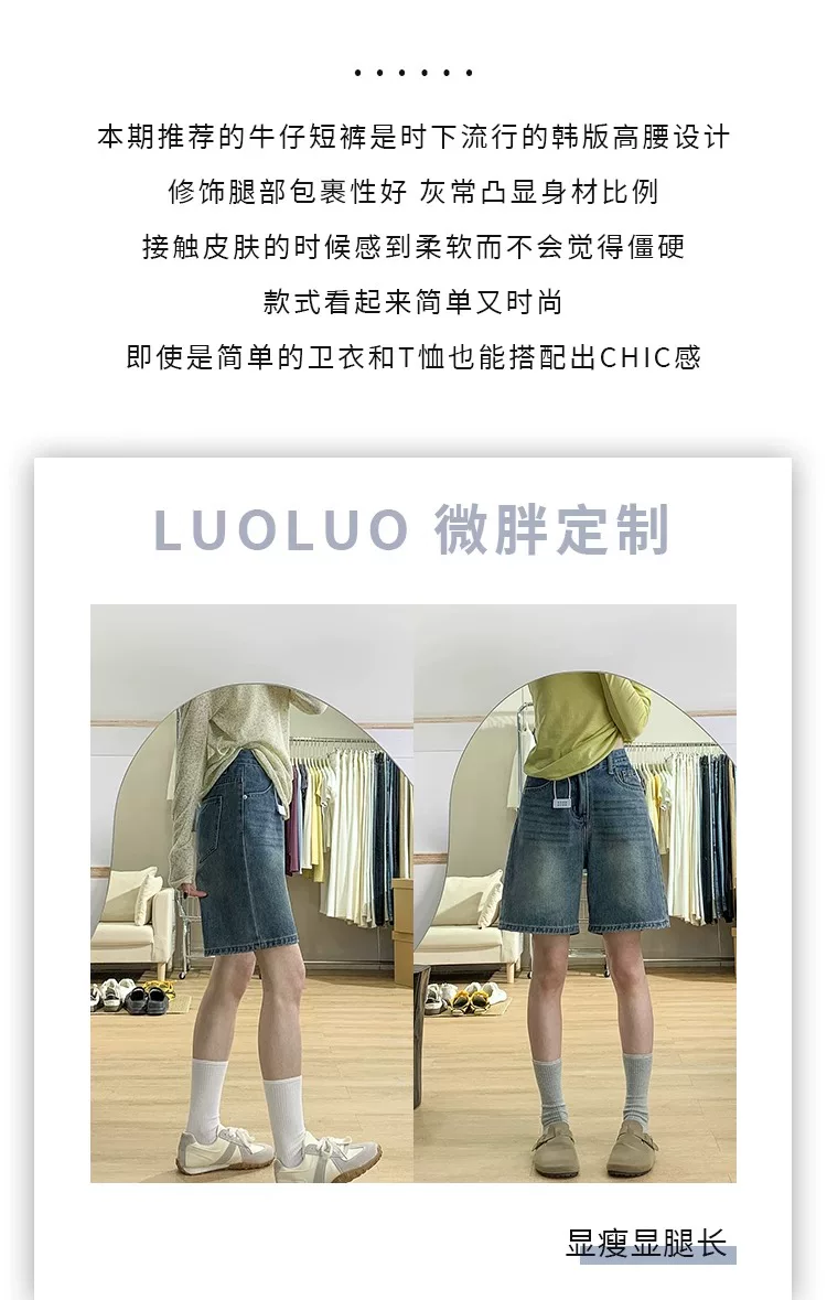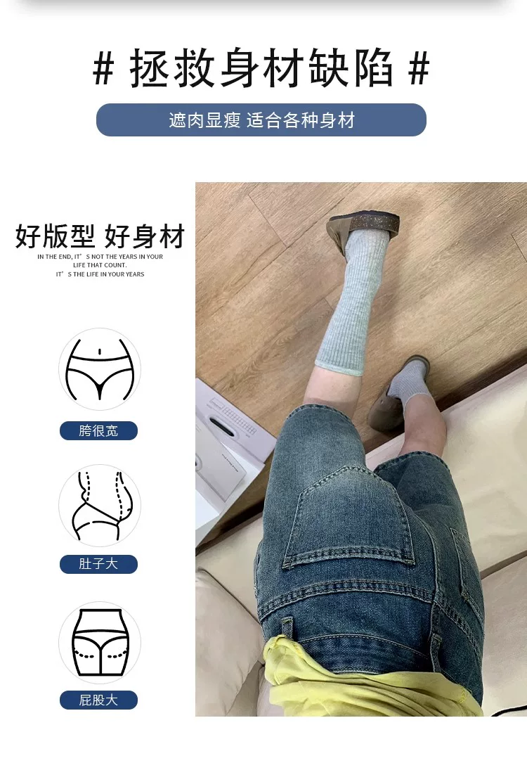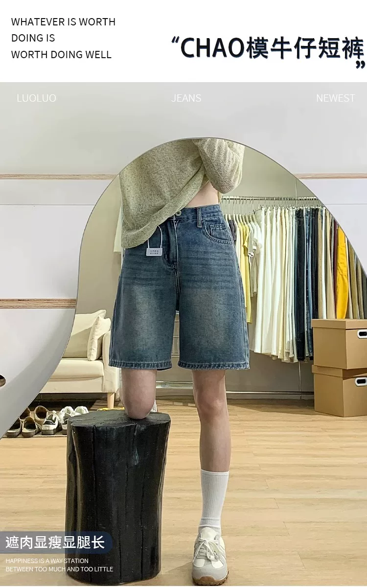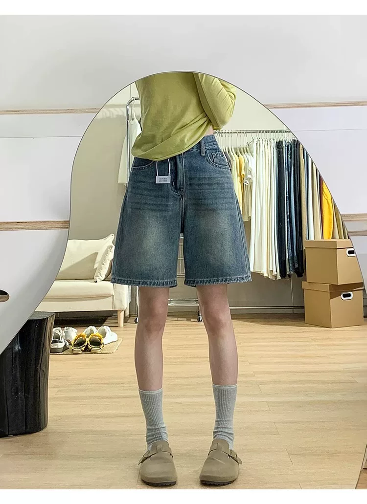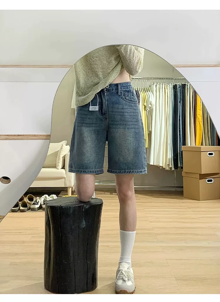 - Quần short denim ống rộng màu xanh cổ điển dành cho nữ, cỡ lớn mùa hè, lưng cao, dáng rộng, thon gọn, dáng quả lê, quần short dài vừa phải.