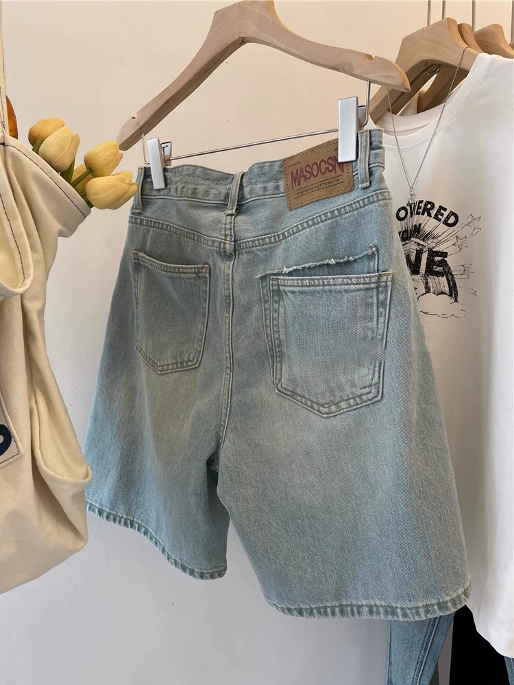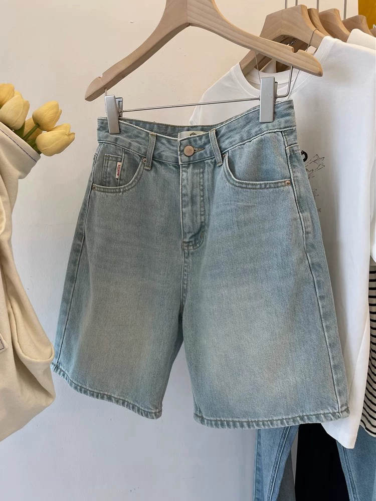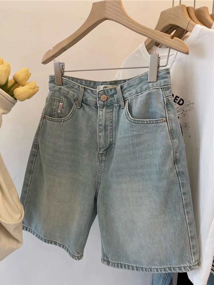 Quần short denim ống thẳng màu sáng dành cho nữ, mùa hè, cỡ lớn, lưng cao, dáng rộng, tôn dáng, đa năng, quần short ống rộng dài đến đầu gối kiểu chữ A.