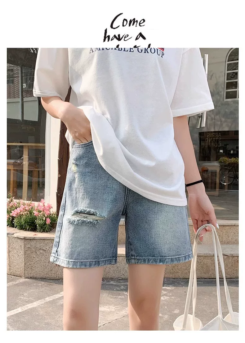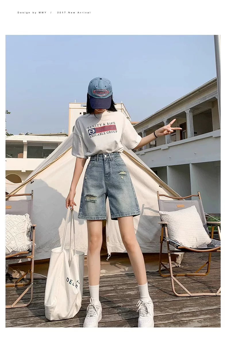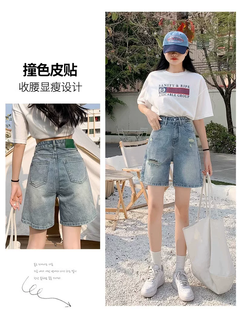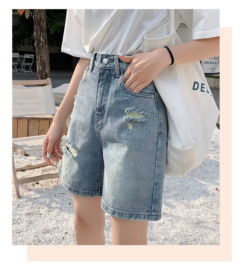 - Quần short denim rách dáng quả lê dành cho nữ, size lớn mùa hè, cạp cao, dáng rộng, tôn dáng, ống thẳng, ống rộng, quần short dài đến giữa đùi.