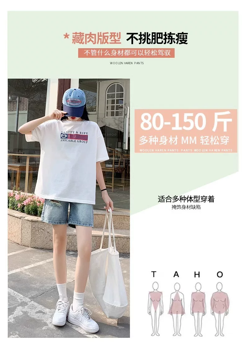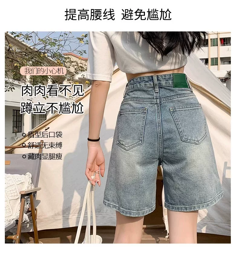 Quần short denim rách dáng quả lê dành cho nữ, size lớn mùa hè, cạp cao, dáng rộng, tôn dáng, ống thẳng, ống rộng, quần short dài đến giữa đùi.