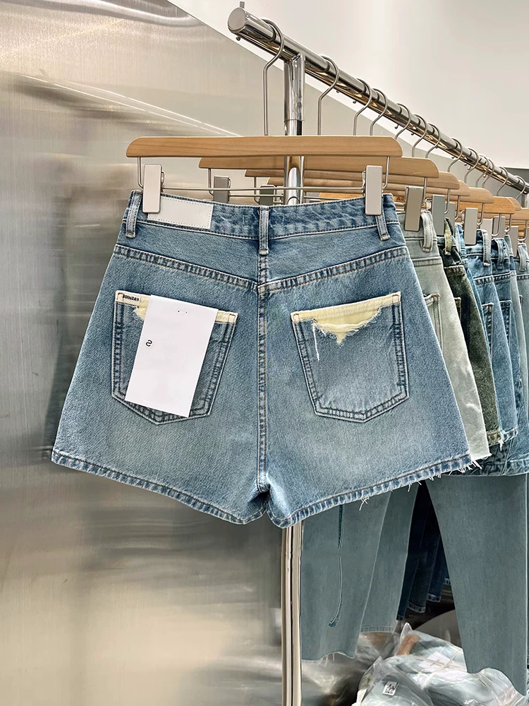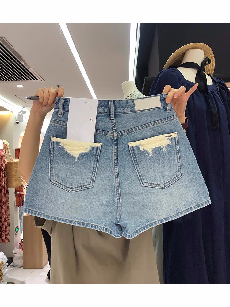 - Quần short denim rách màu xanh nhạt dành cho nữ, kiểu dáng mỏng mùa hè, cỡ lớn, lưng cao, dáng rộng, quần ống rộng chữ A tôn dáng.