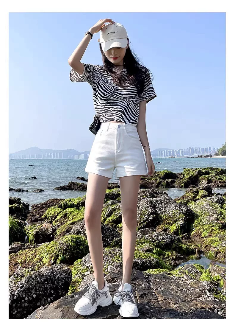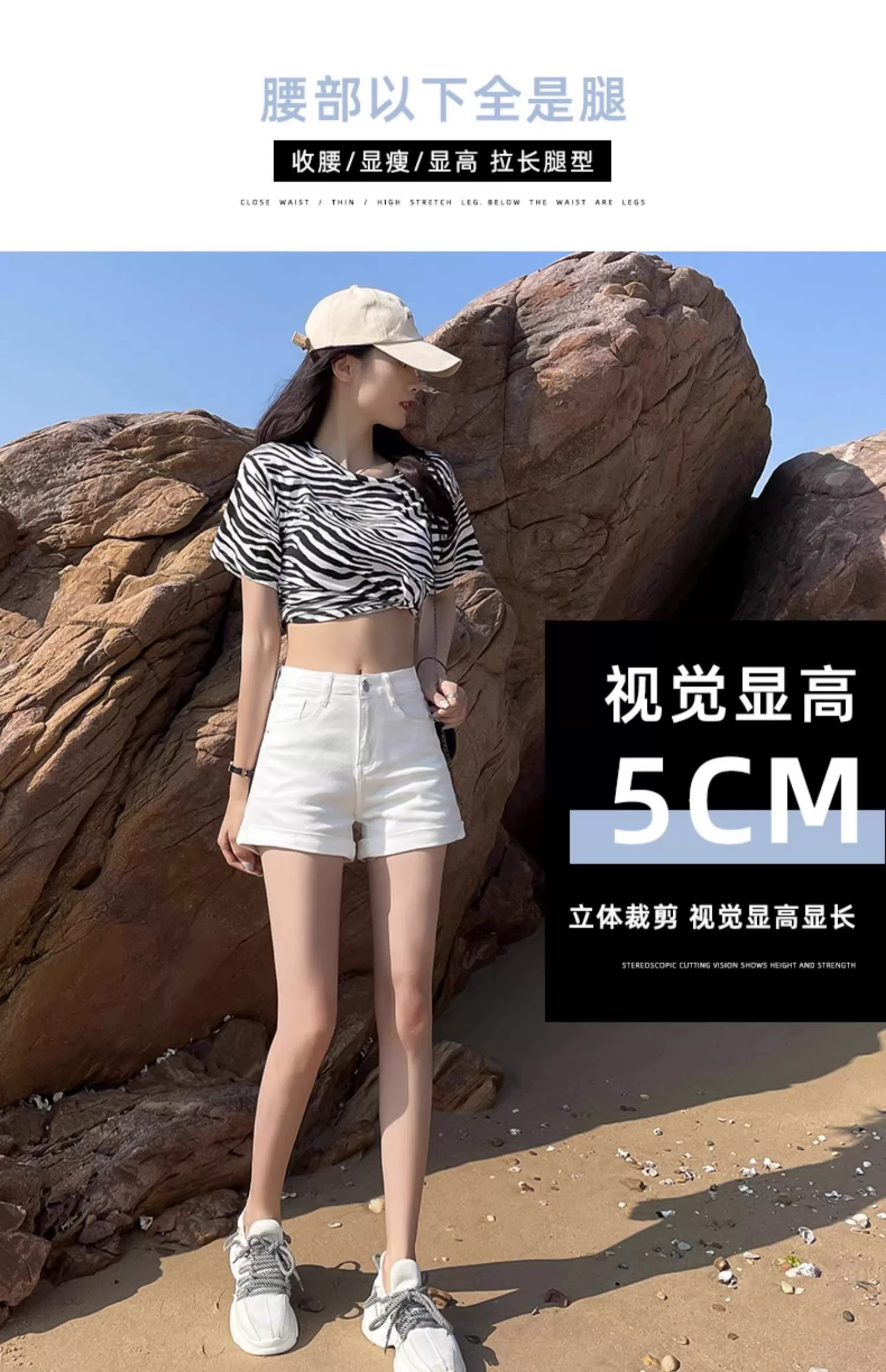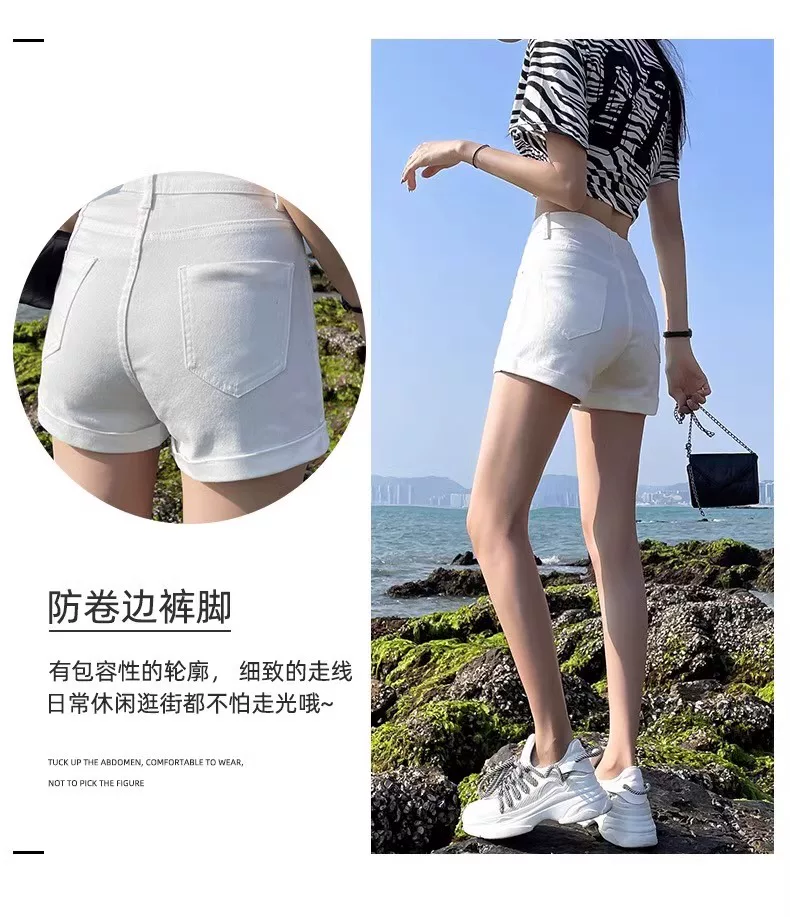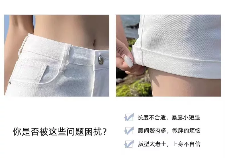 - Quần short denim trắng cho nữ, cỡ lớn mùa hè, lưng cao, co giãn, giảm béo, dáng quả lê, quần ống rộng chữ A.