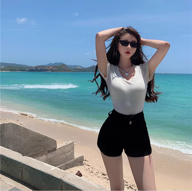 Quần short denim trắng cho nữ, quần mùa hè, hợp thời trang và sành điệu, cạp cao, bó sát, quần ngắn.