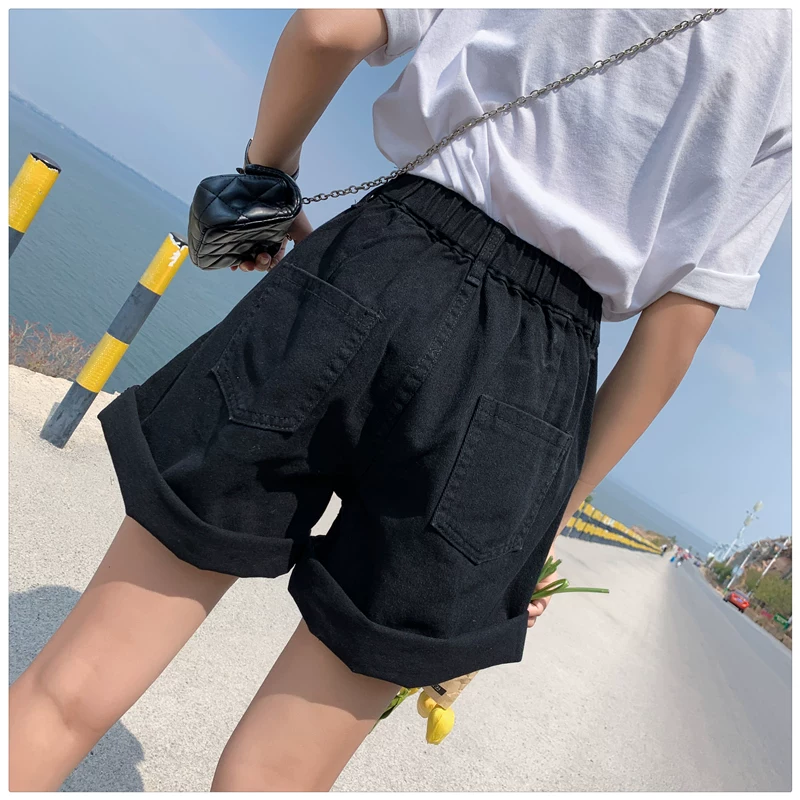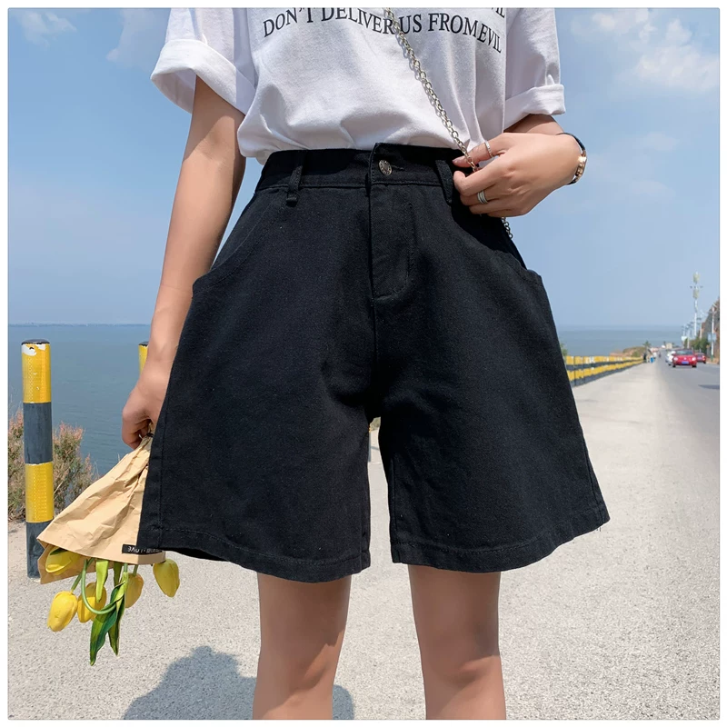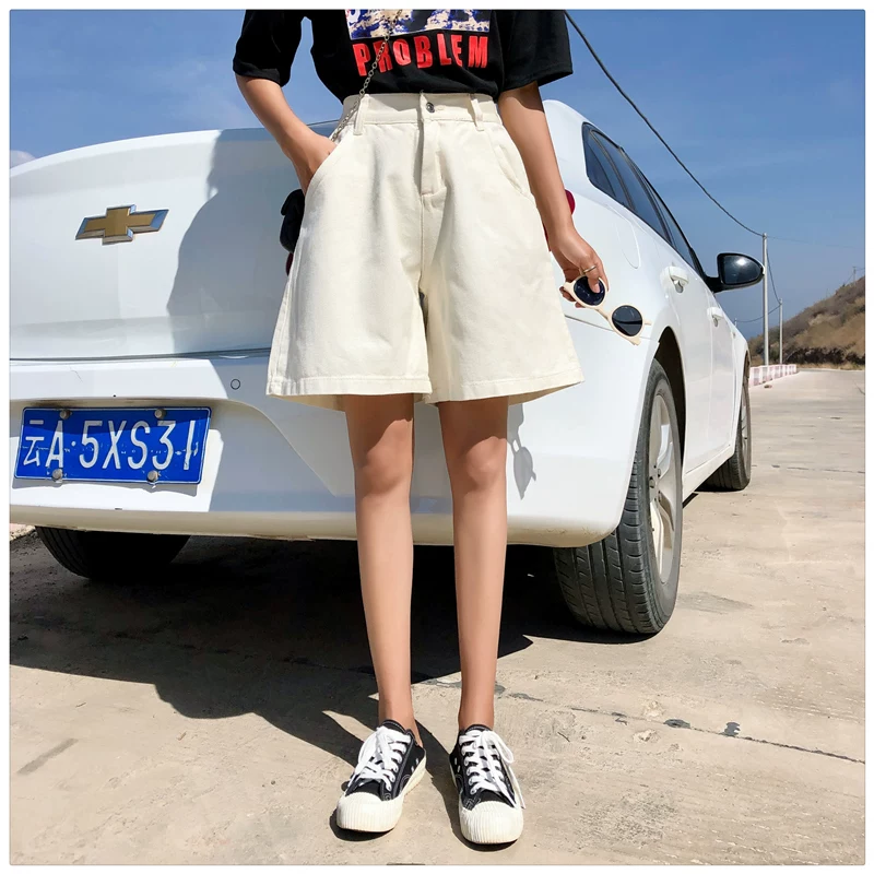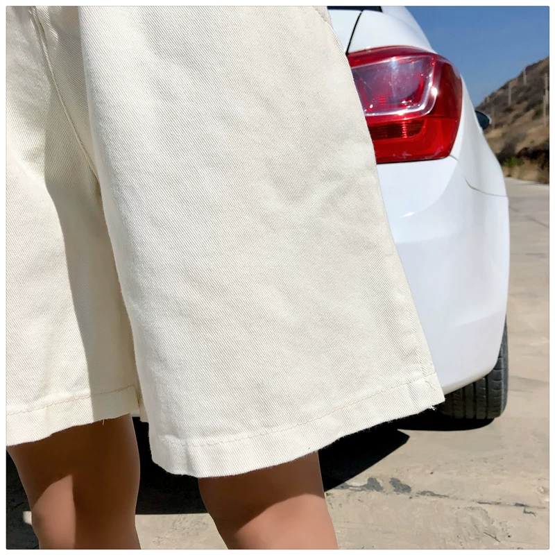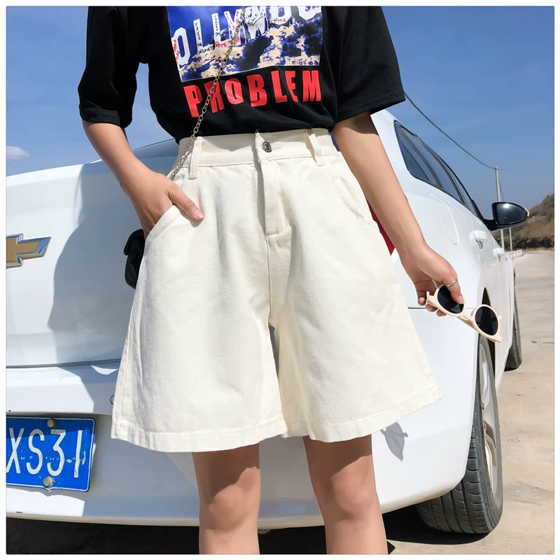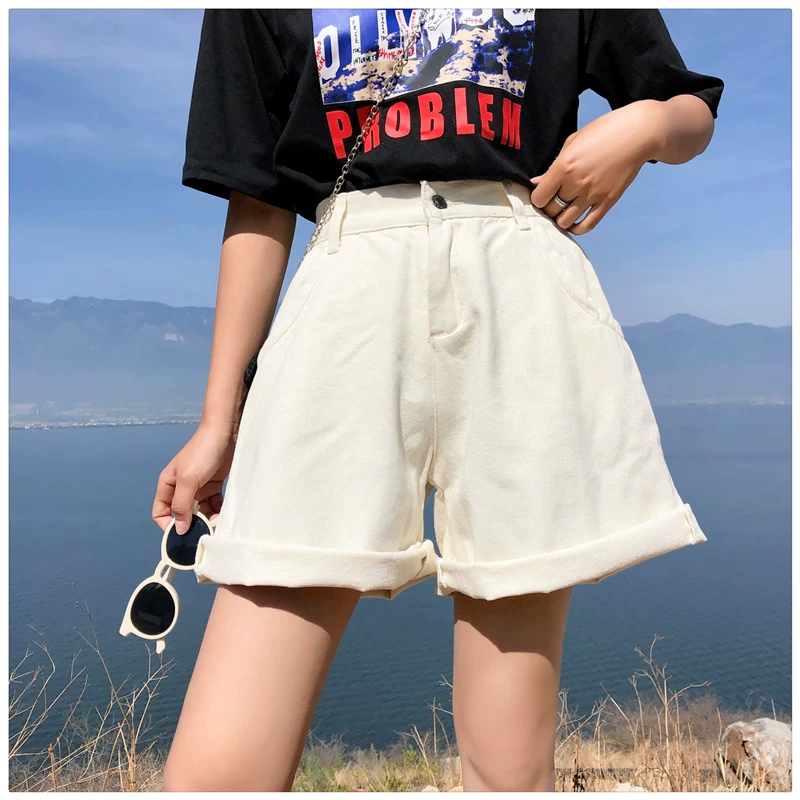 - Quần short denim trắng dáng quả lê dành cho nữ, size lớn mùa hè, cạp cao, dáng rộng, tôn dáng, quần ống rộng dáng chữ A năm điểm