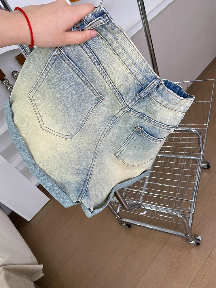 - Quần short denim viền lượn sóng dành cho nữ, size lớn mùa hè, kiểu dáng thời trang đính đá cao cấp, cạp cao, dáng rộng, tôn dáng, quần ống rộng chữ A
