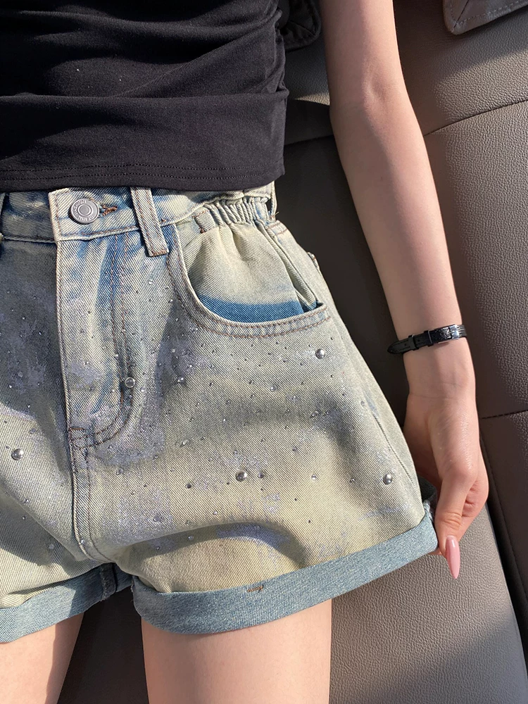 Quần short denim viền lượn sóng dành cho nữ, size lớn mùa hè, kiểu dáng thời trang đính đá cao cấp, cạp cao, dáng rộng, tôn dáng, quần ống rộng chữ A