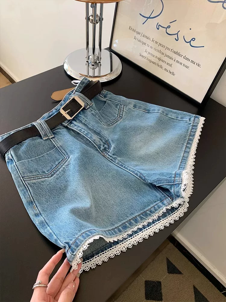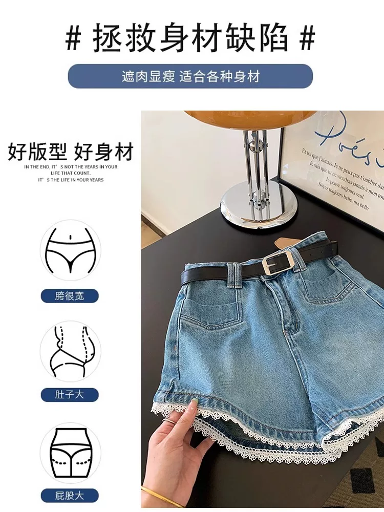 Quần short denim viền ren dành cho nữ, cỡ lớn mùa hè, lưng cao, dáng rộng, tôn dáng, dáng quả lê, quần ống rộng chữ A