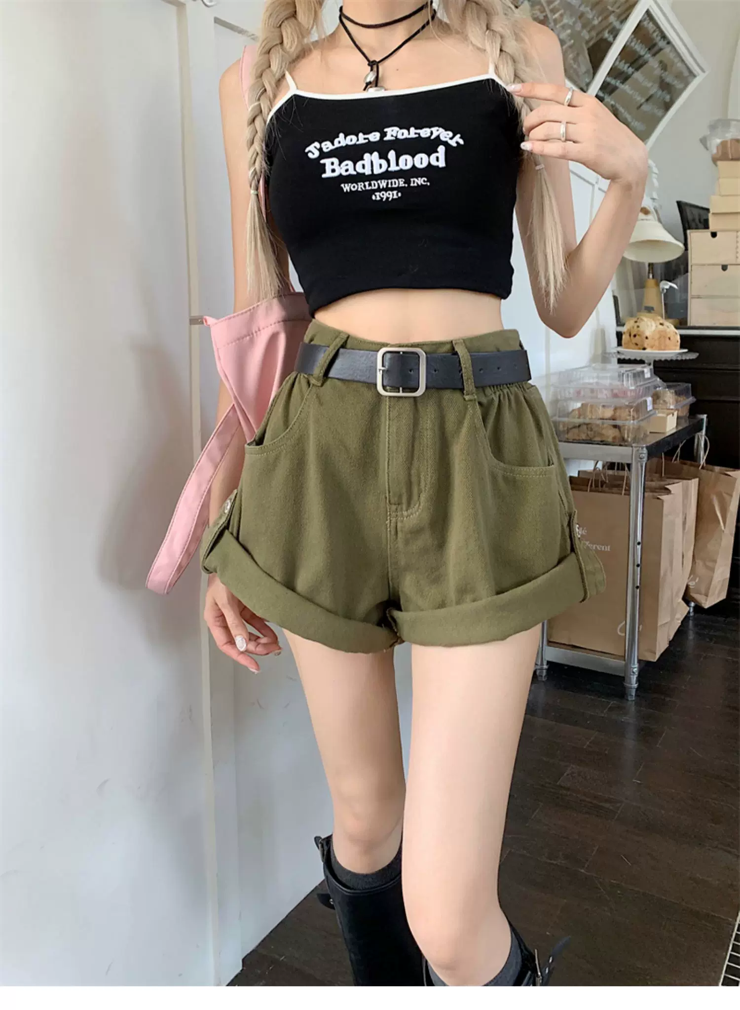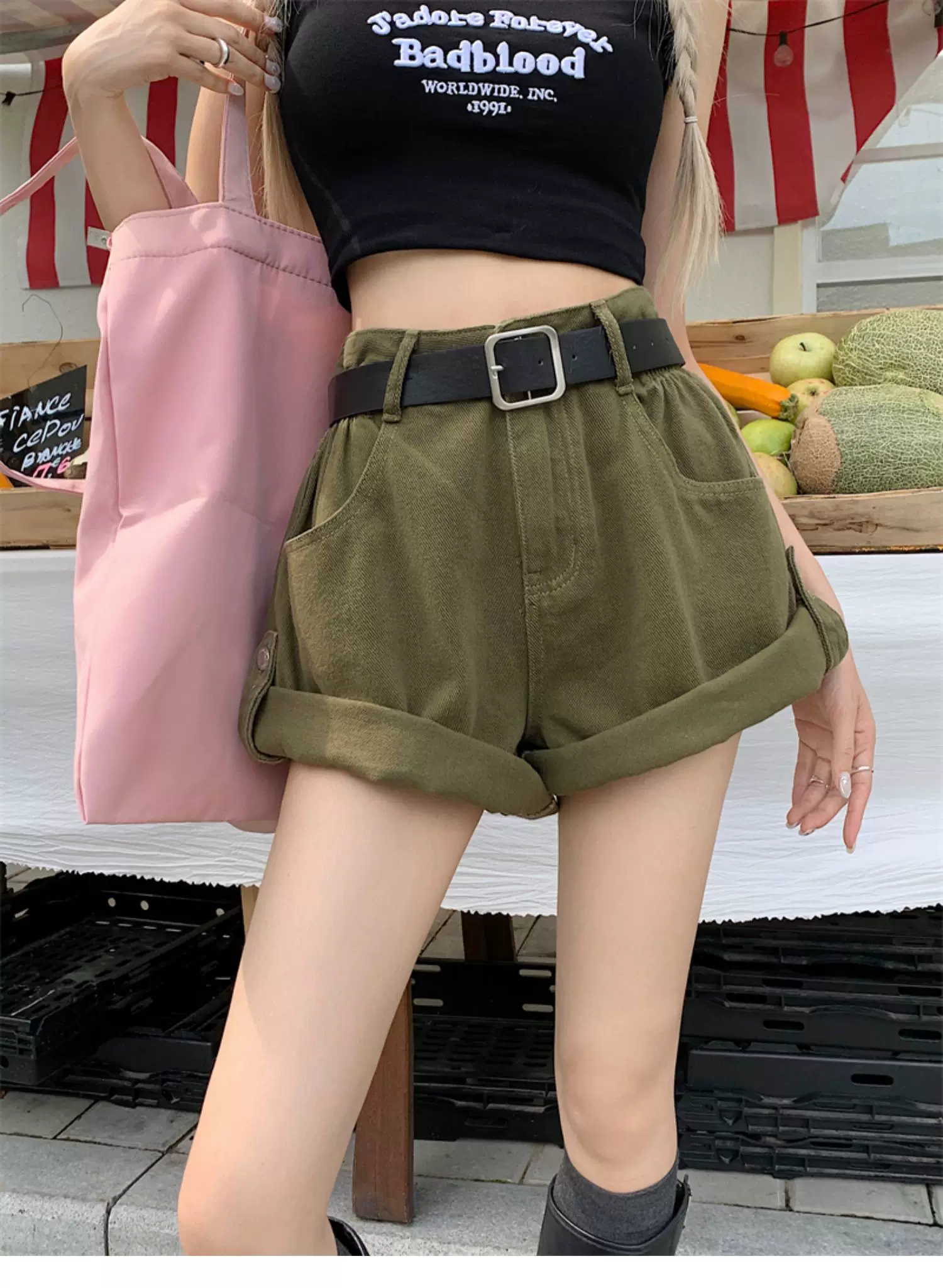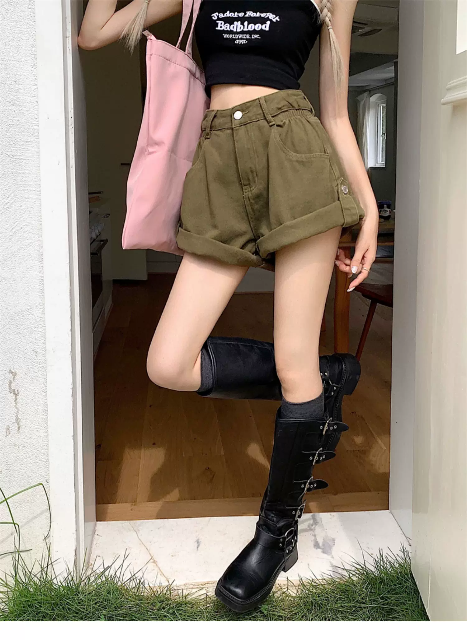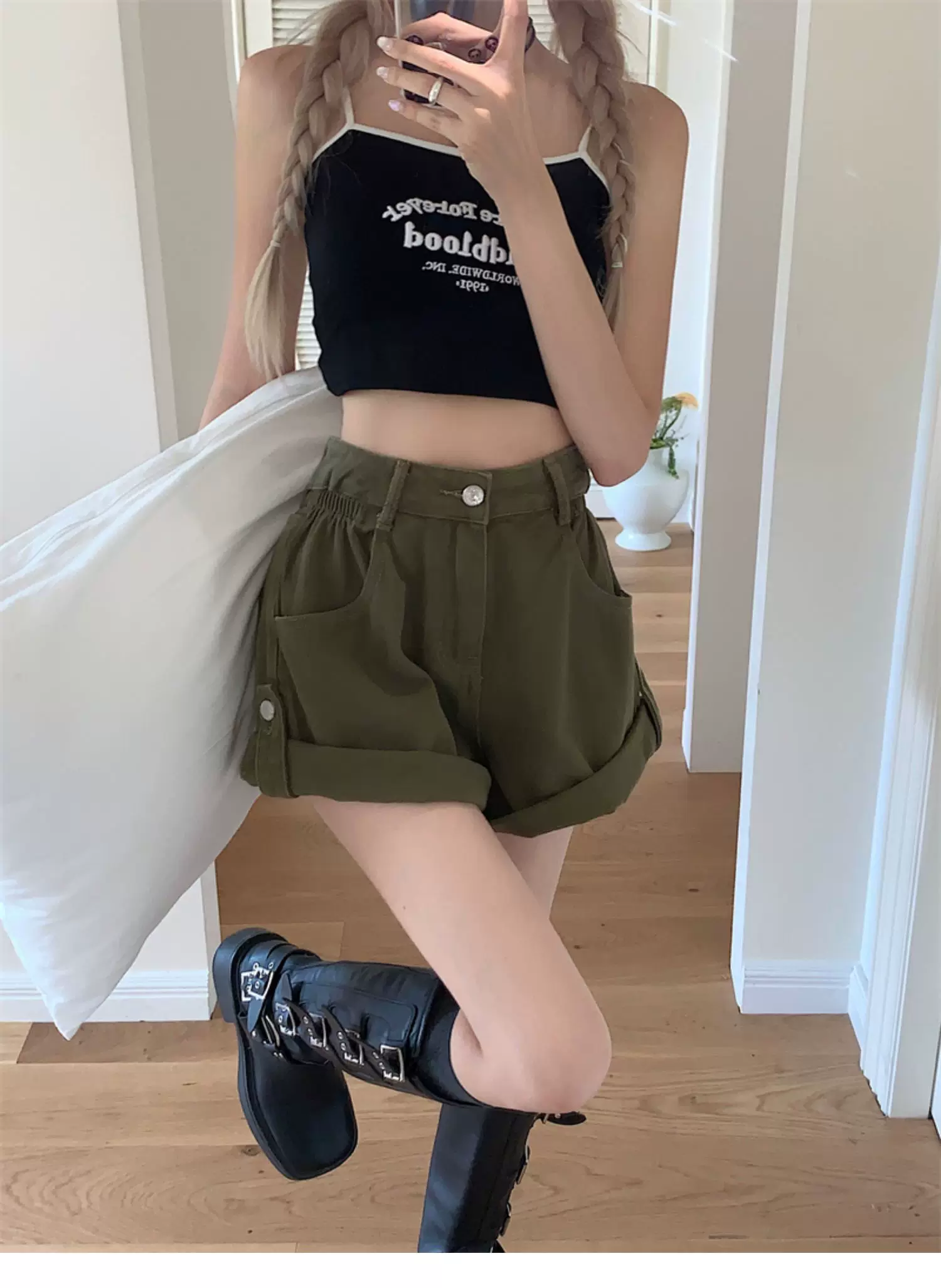 - Quần short denim viền xanh quân đội dành cho nữ, cỡ lớn mùa hè, lưng cao, dáng rộng, che hông, quần ống rộng chữ A tôn dáng