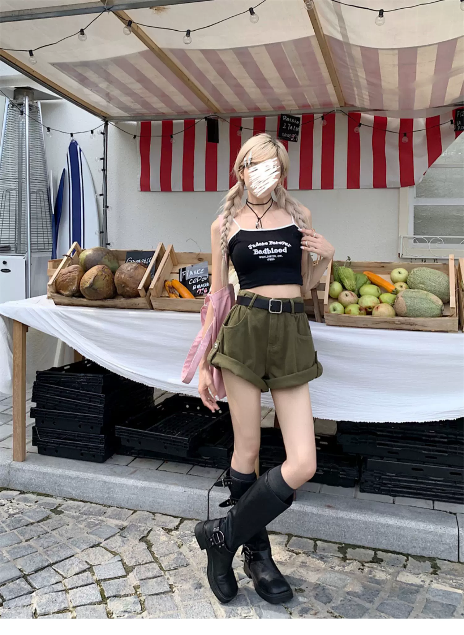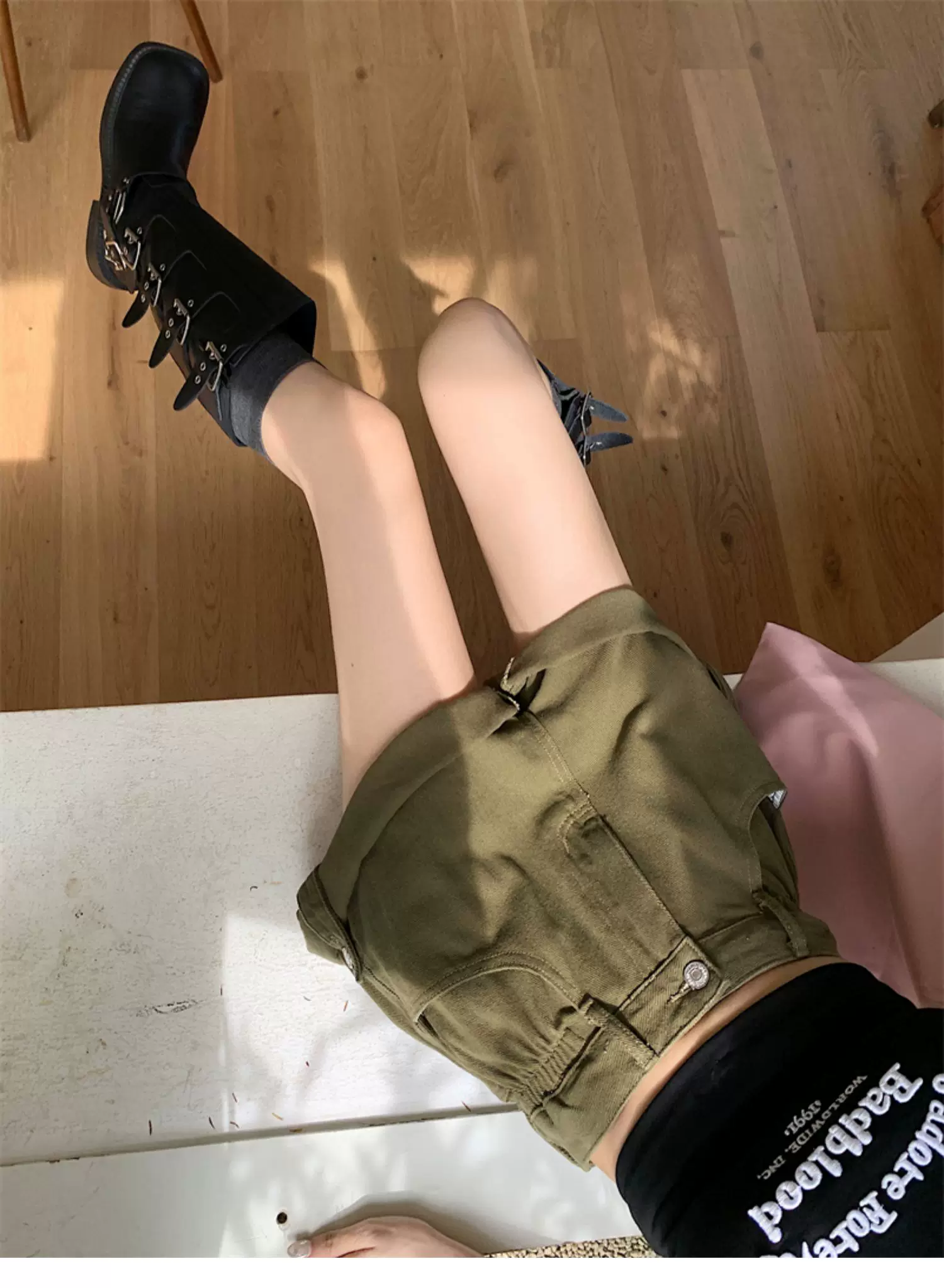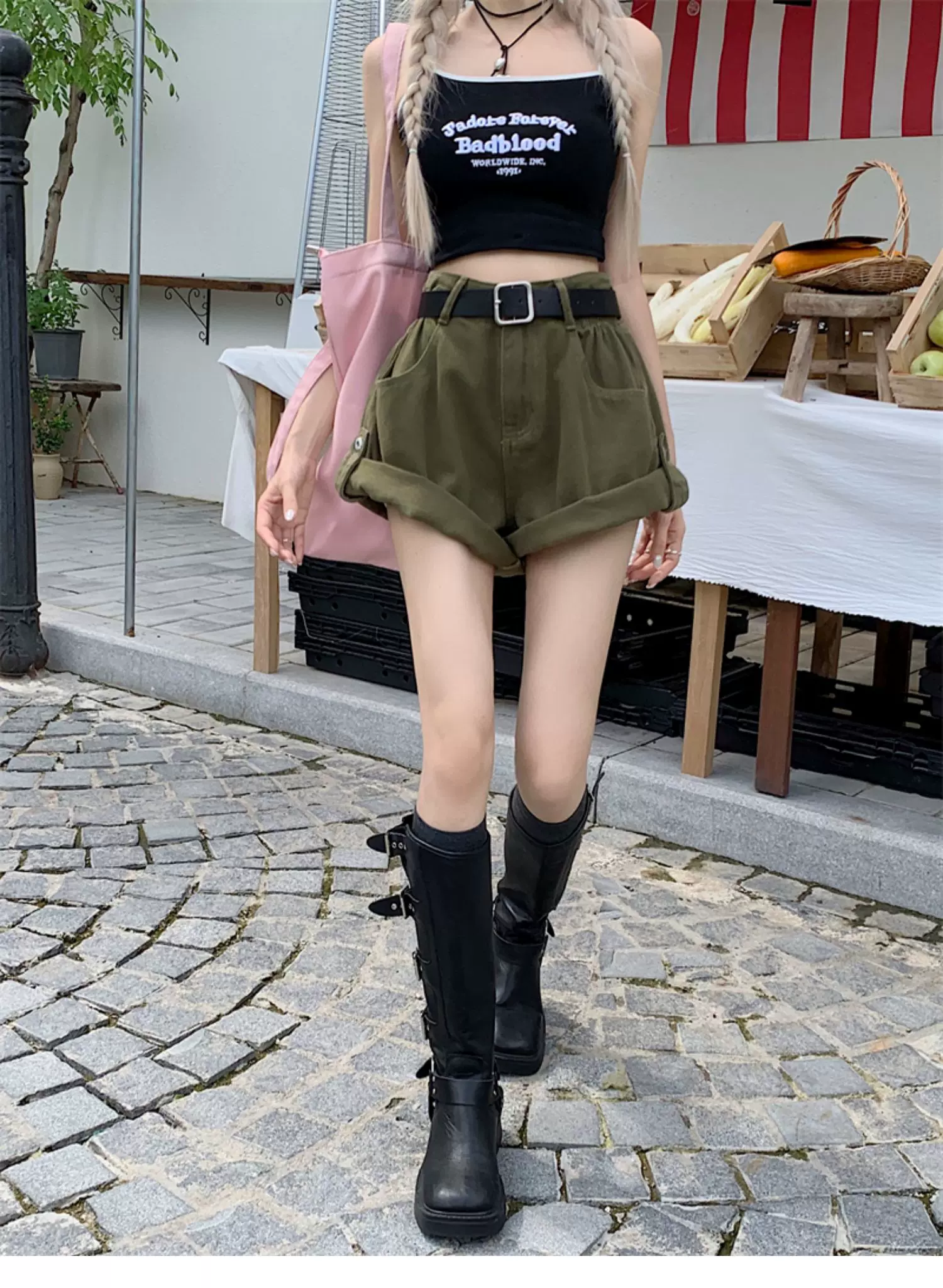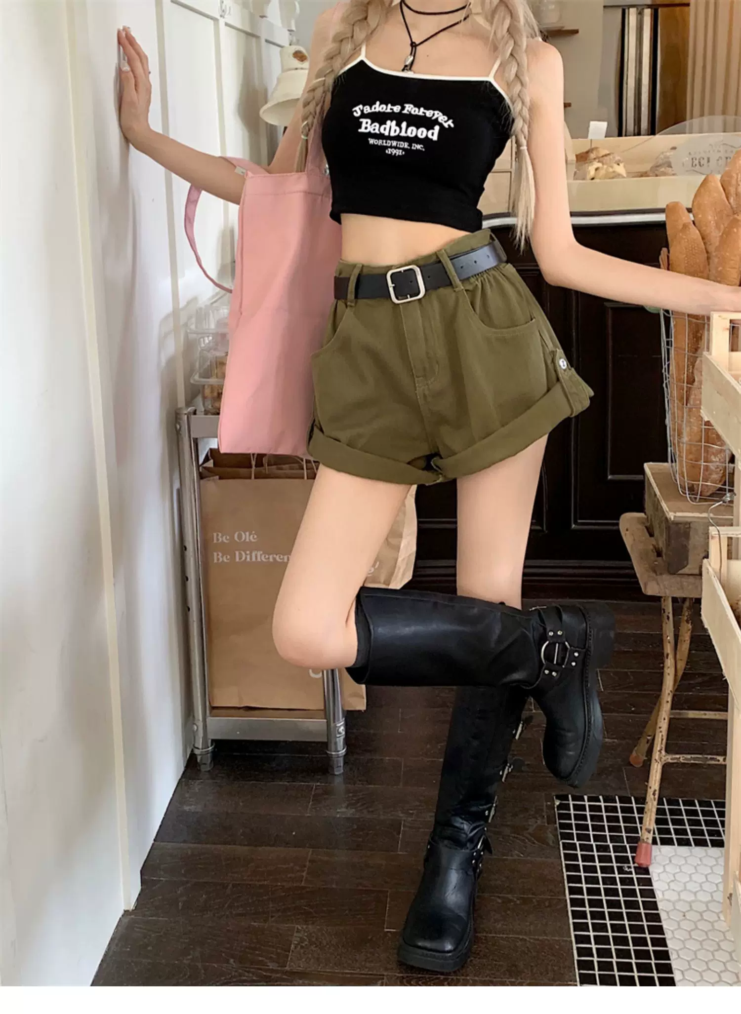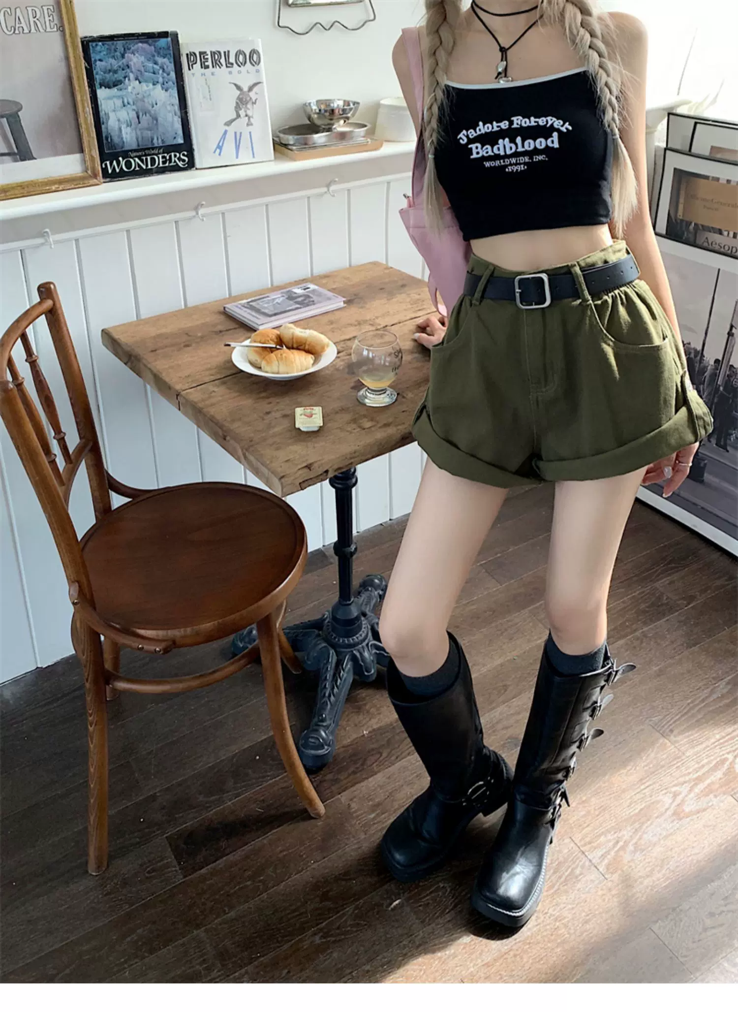 - Quần short denim viền xanh quân đội dành cho nữ, cỡ lớn mùa hè, lưng cao, dáng rộng, che hông, quần ống rộng chữ A tôn dáng