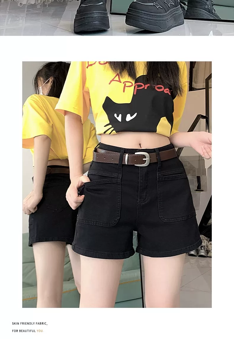 Quần short denim xanh đậm dành cho nữ, kiểu mới hè 2025, size lớn, cạp cao, che hông, tôn dáng, dáng chữ A, ống rộng, quần short thời trang.