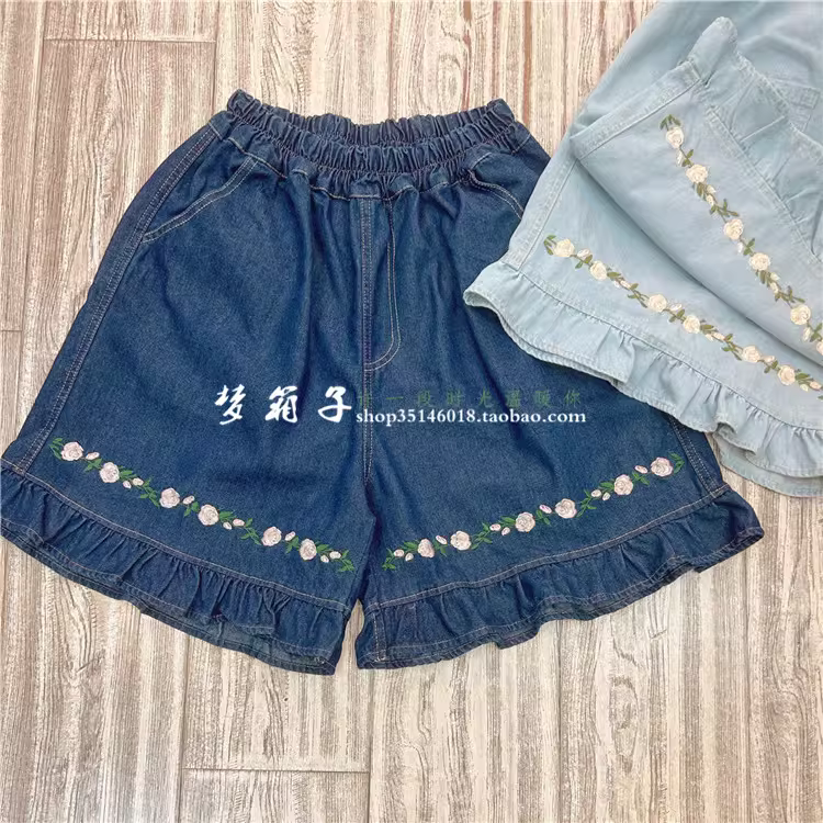 棉质牛仔面料,清新小花朵刺绣,木耳边裤腿,松紧腰设计,宽松版型