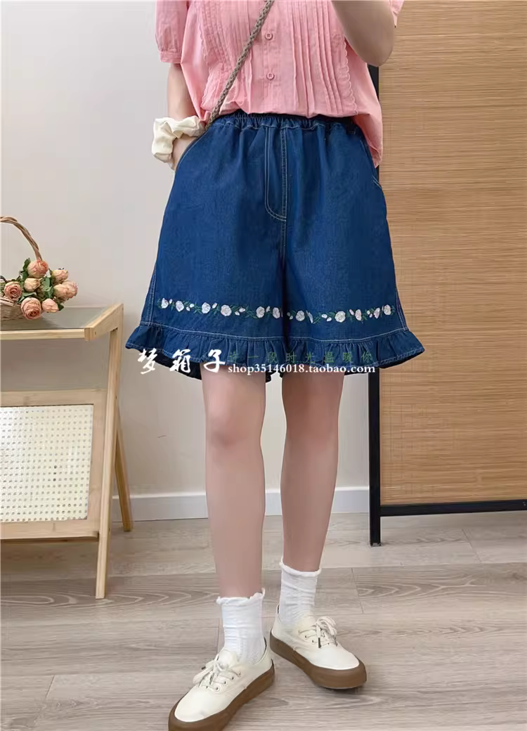 - Quần short denim xếp ly dáng rộng, lưng thun, thêu hoa nhỏ, kiểu mới hè 2025, Dream Box