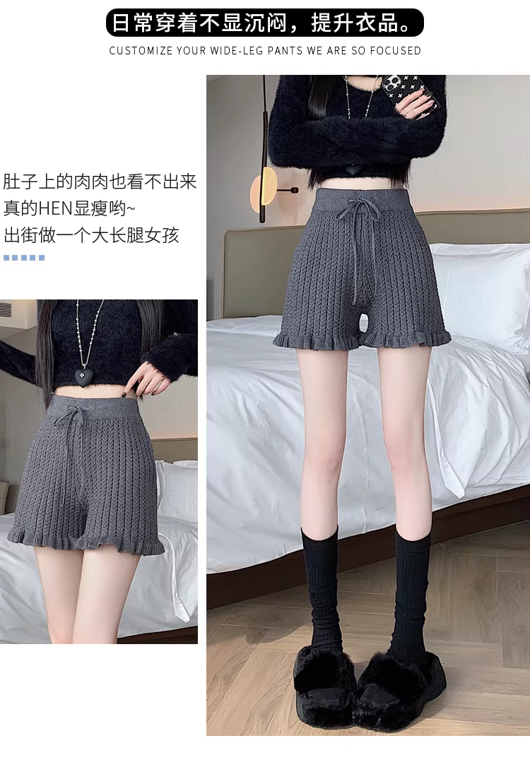 Quần short dệt kim màu xám cho nữ, áo khoác ngoài mùa thu đông, kiểu mới 2025, lưng thun, viền xếp ly, quần nữ, quần dệt kim, quần ống loe.
