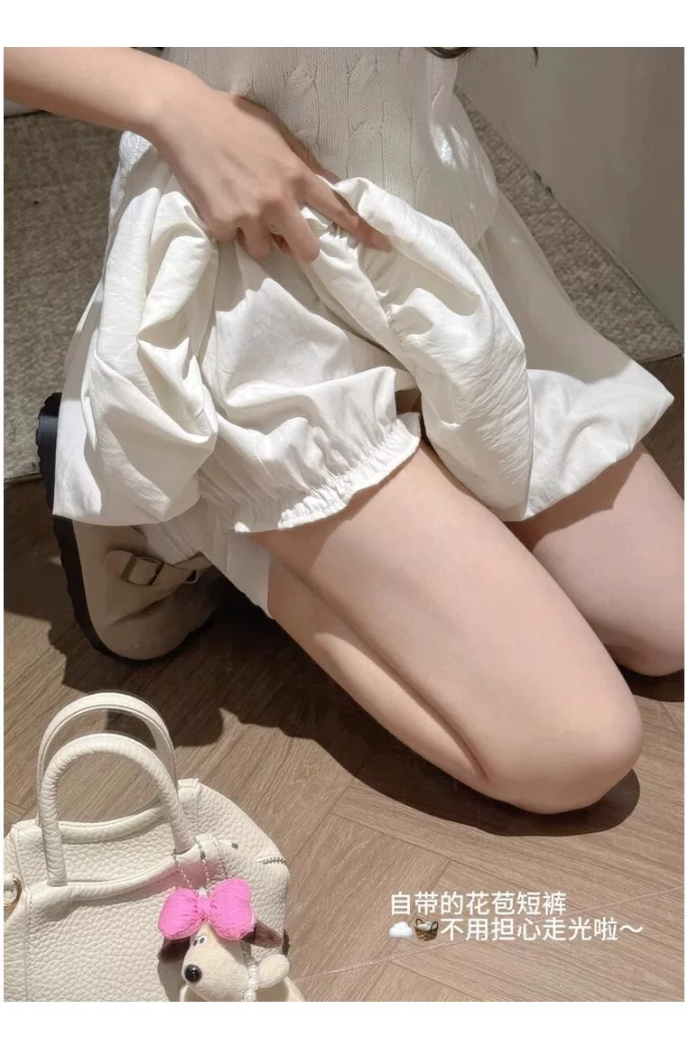 Quần short hoa trắng dành cho nữ, cỡ lớn mùa hè, cạp cao, che hông, quần short váy chữ A thon gọn cho người nhỏ nhắn, váy ngắn phồng.