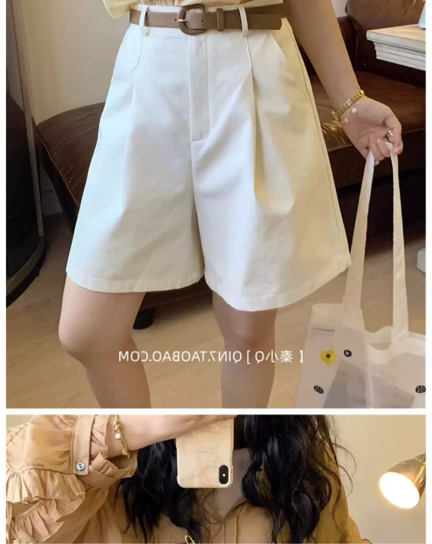 Quần short kaki cạp cao thường ngày dành cho nữ, size lớn mùa hè, đa năng, tôn dáng, dáng thẳng, kiểu chữ A, dài ngang đùi, ống rộng.
