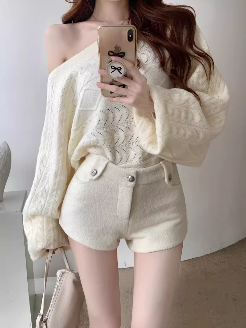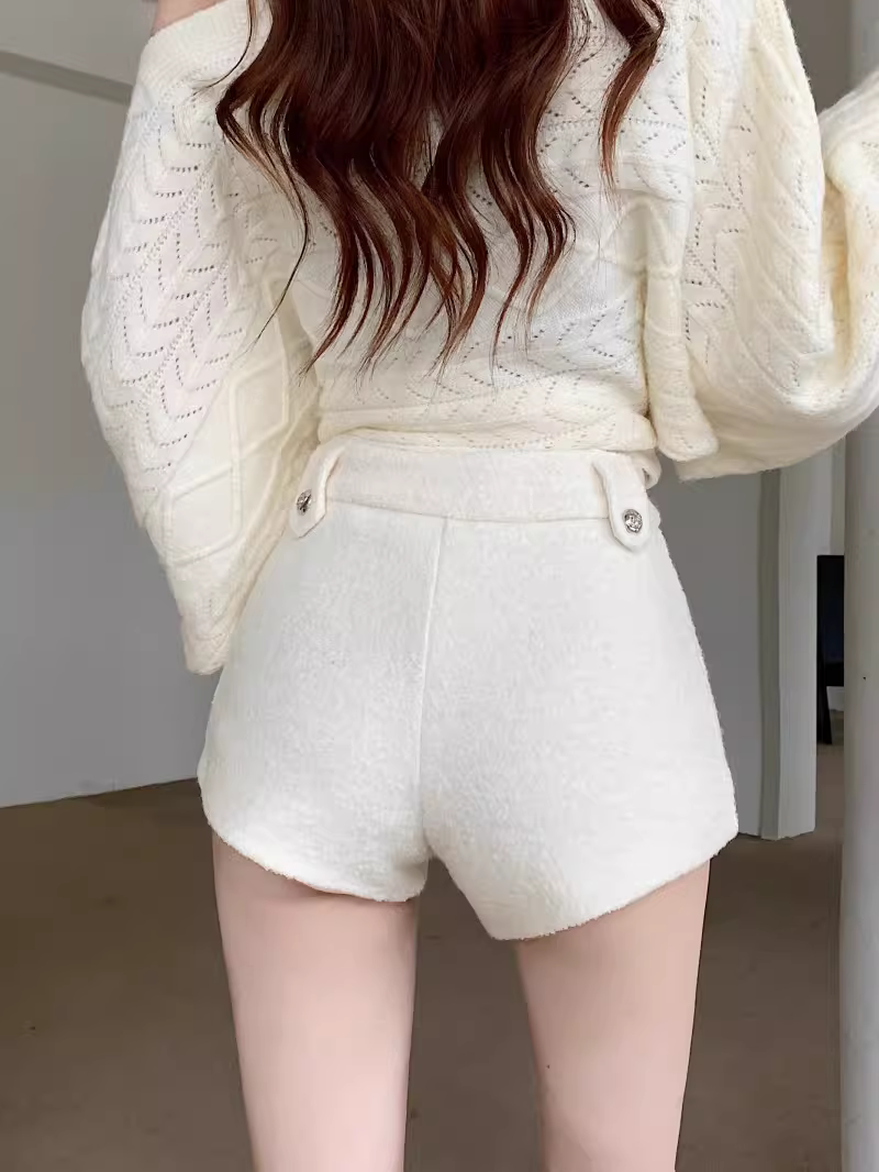 Quần short len màu trắng nhạt dành cho nữ, áo khoác ngoài mùa thu đông, quần nữ cạp thấp, quần kiểu Chanel, quần hot girl để phối với giày bốt.