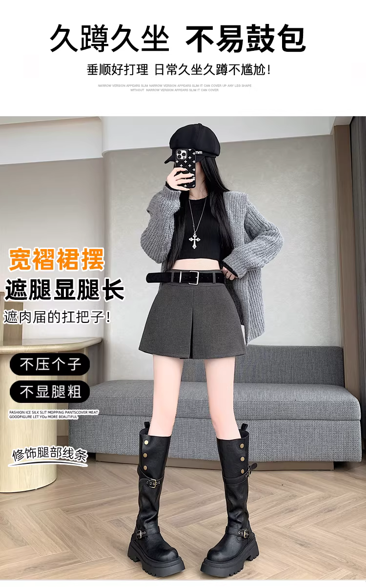 - Quần short len màu xám dành cho nữ, quần len ống rộng lưng cao mới mùa thu đông 2025 dành cho nữ, phối với ủng, quần kiểu Martin.