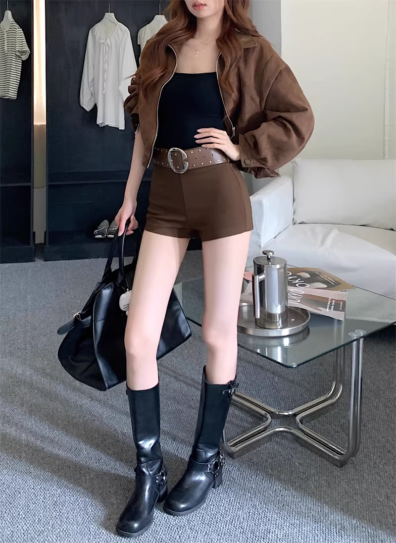 Quần short màu nâu dành cho nữ, thích hợp cho mùa xuân, mùa thu và mùa đông, quần bó sát lưng cao thời trang, quần short kiểu boot.