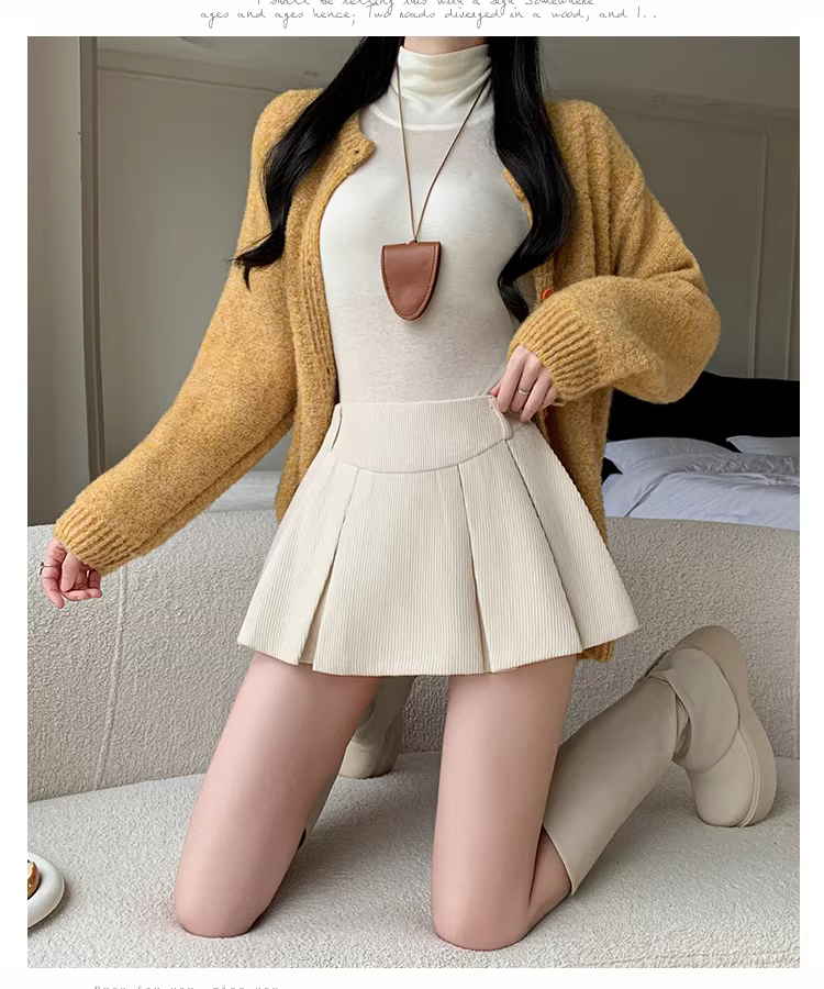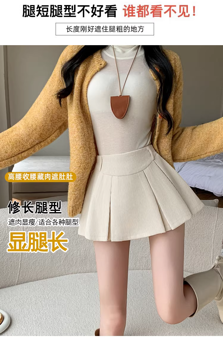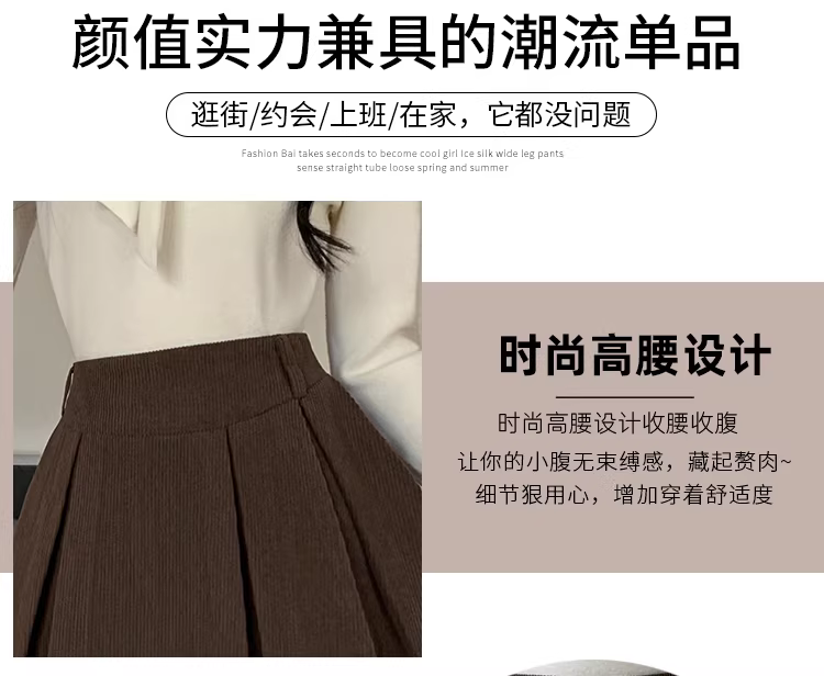 Quần short nhung kẻ màu nâu cho nữ, áo khoác ngoài mùa thu đông, quần váy nhung kẻ, quần váy xếp ly giả hai mảnh, quần ống loe cho nữ.