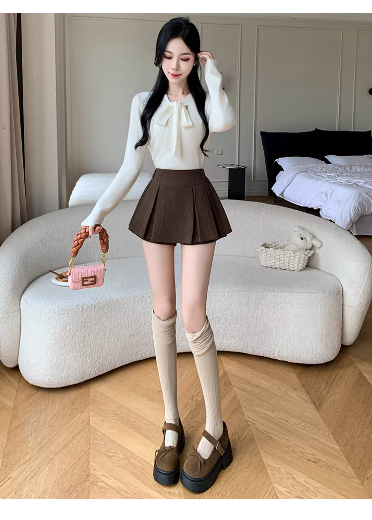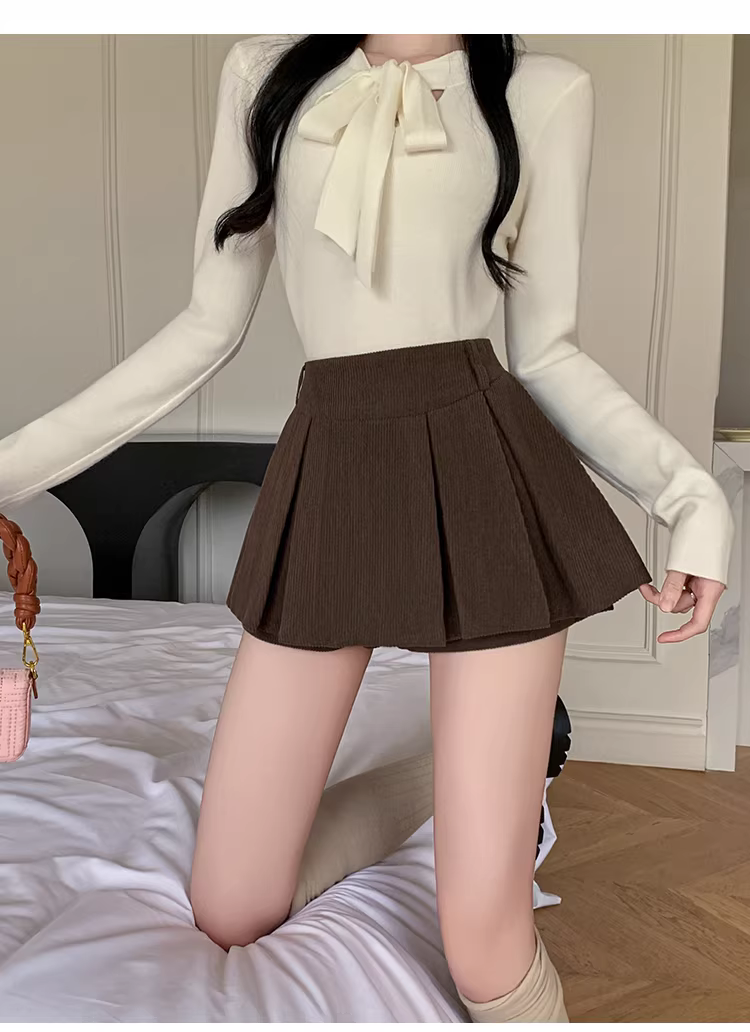 - Quần short nhung kẻ màu nâu cho nữ, áo khoác ngoài mùa thu đông, quần váy nhung kẻ, quần váy xếp ly giả hai mảnh, quần ống loe cho nữ.