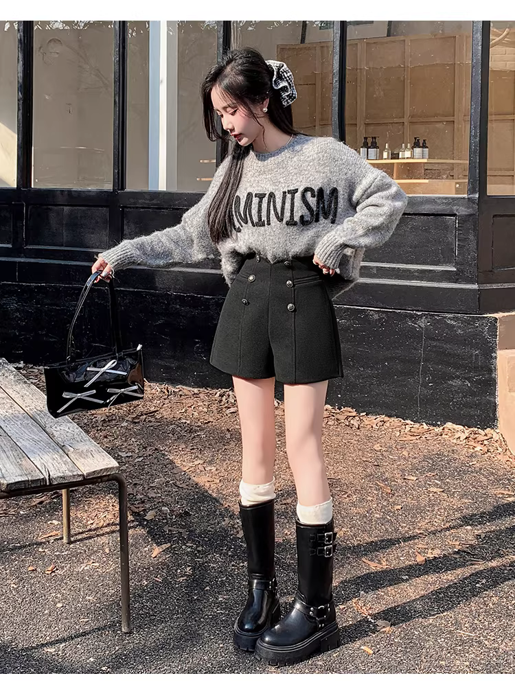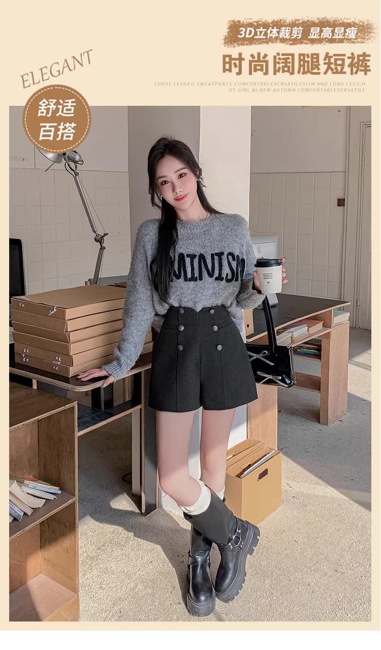 - Quần short nữ cạp cao, kiểu dáng vest, chất liệu len có khuy, quần ống rộng dáng chữ A.