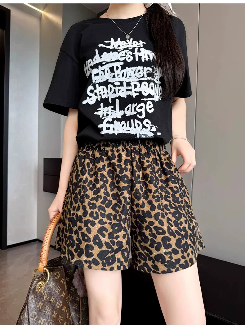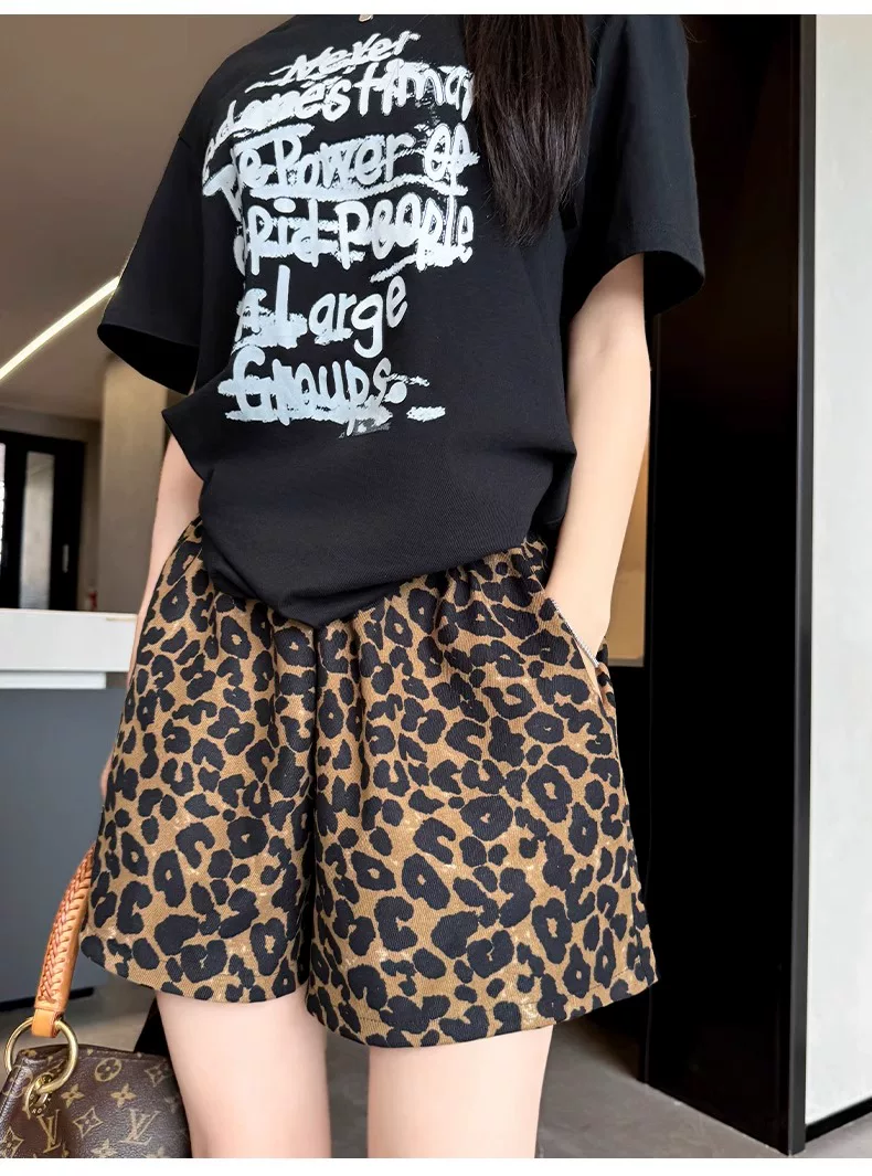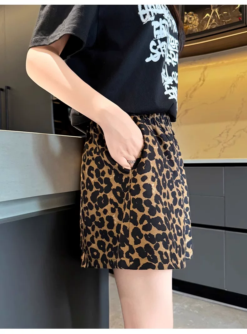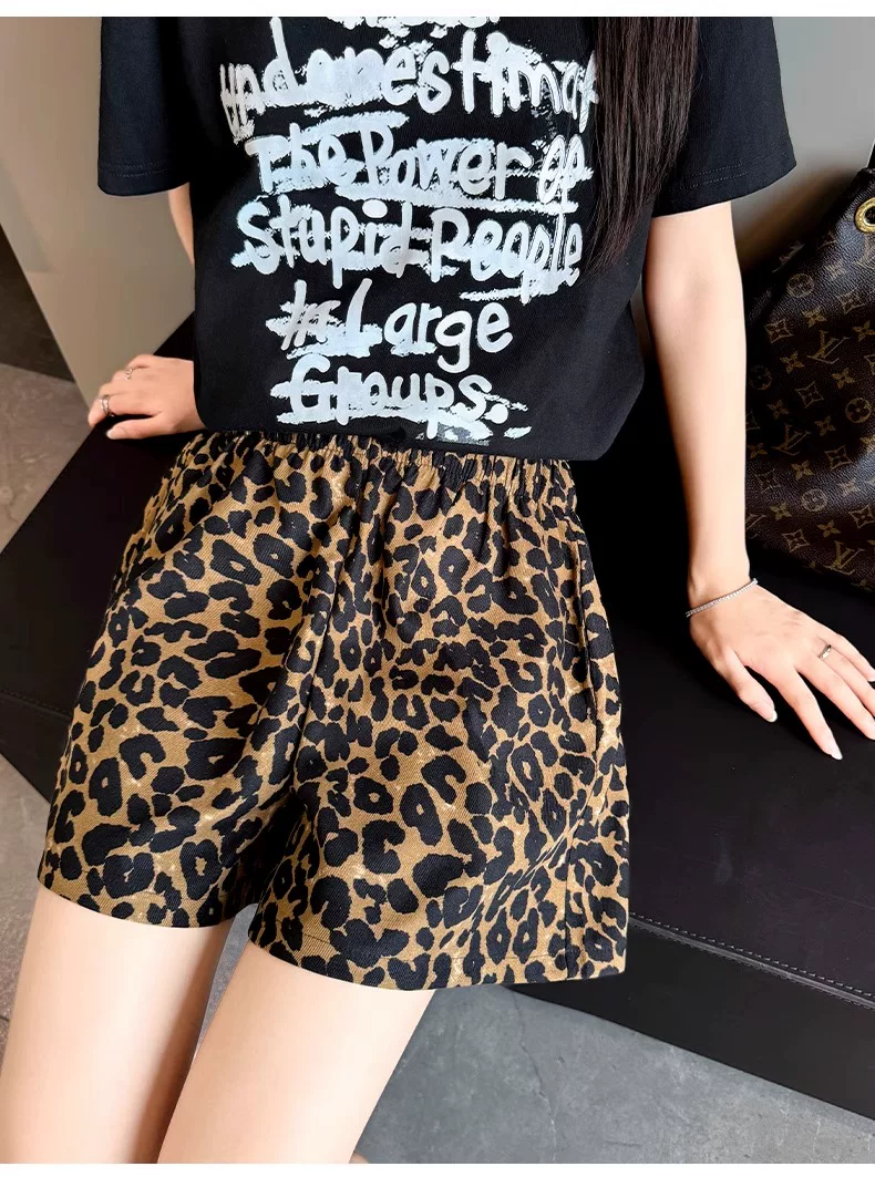 Quần short vải lụa in họa tiết da báo dành cho nữ, kiểu dáng mỏng mùa hè, cỡ lớn, lưng cao, dáng rộng, quần thể thao dáng chữ A dáng rộng, quần ống rộng.
