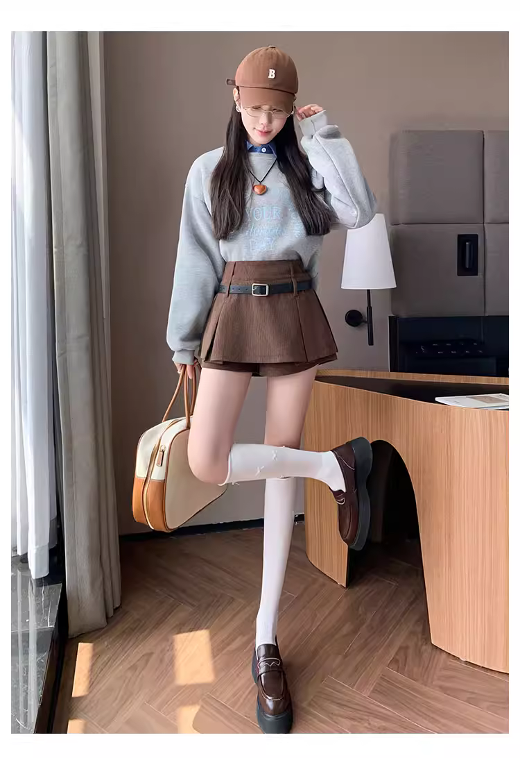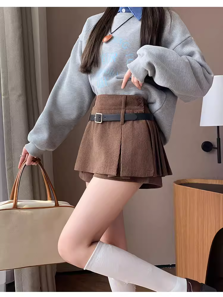 - Quần short vải nhung kẻ cho nữ, áo khoác ngoài mùa thu đông, quần váy vải nhung kẻ, quần váy ngắn hai trong một, quần ống rộng xếp lớp chữ A