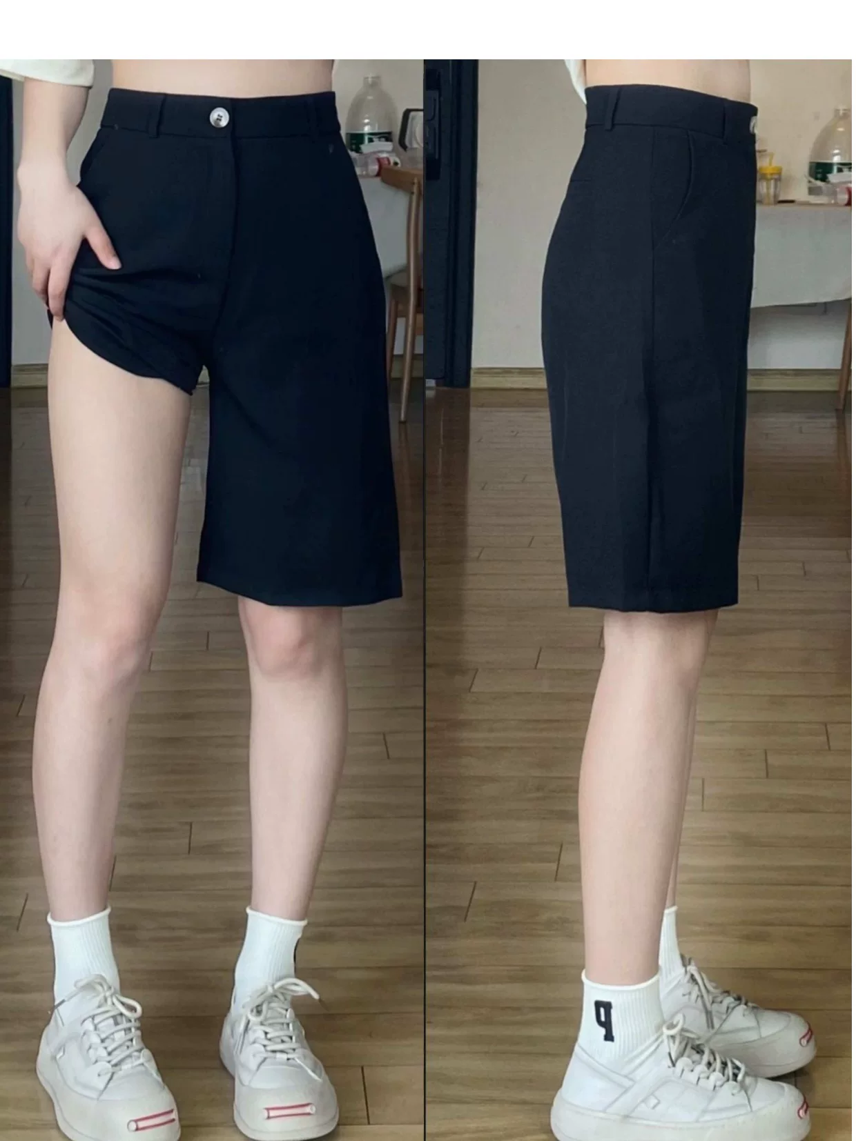 Quần short vest đen dáng quả lê, cạp cao dành cho nữ, kiểu dáng mỏng mùa hè, size lớn, che hông, tôn dáng, quần short ống rộng
