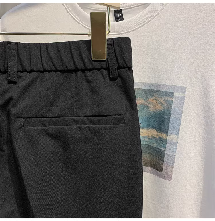 Quần tây nam LUUD màu trắng, lưng thun nửa phần, kiểu dáng ôm sát, phong cách quý ông Anh, dáng thẳng, ống lửng.