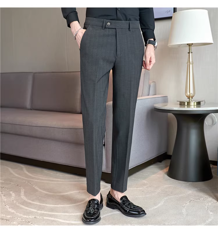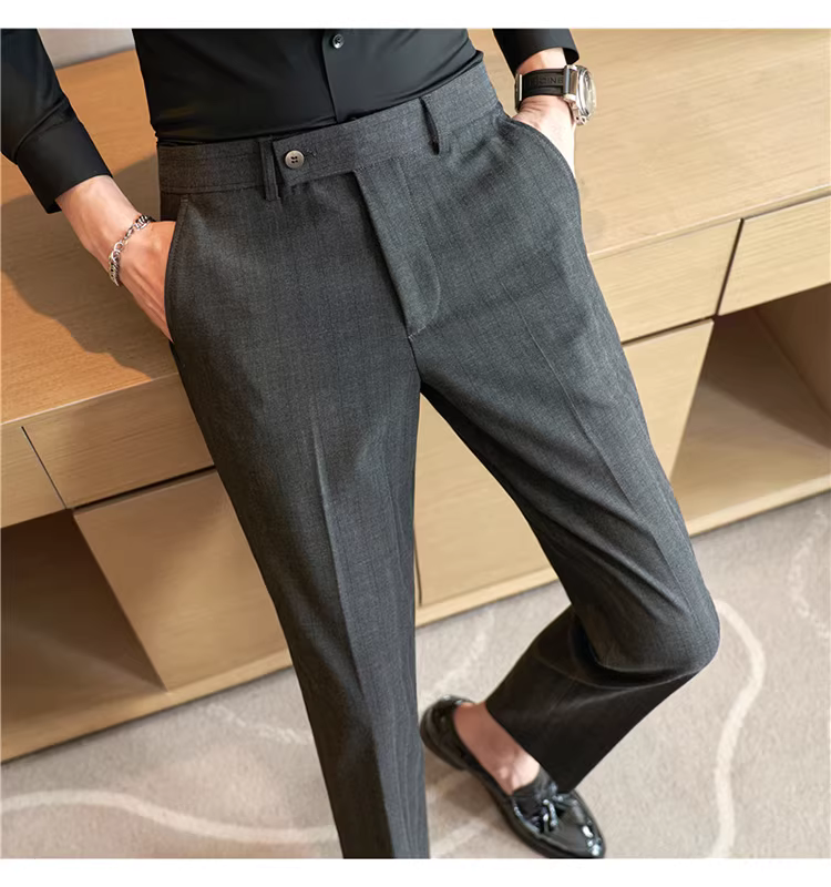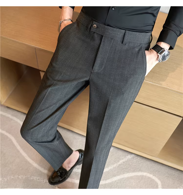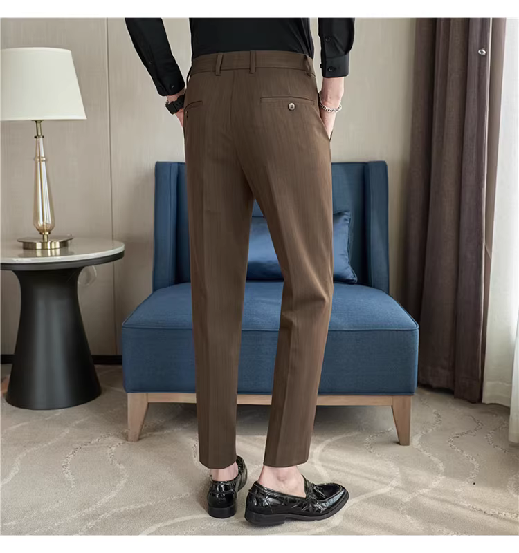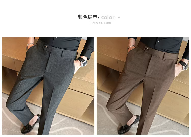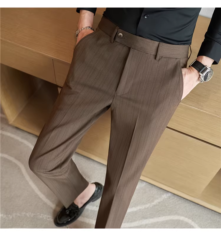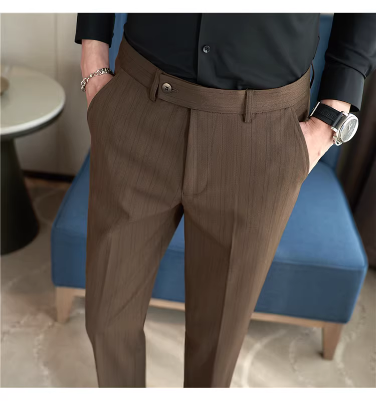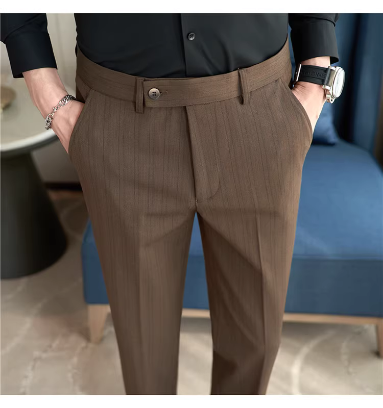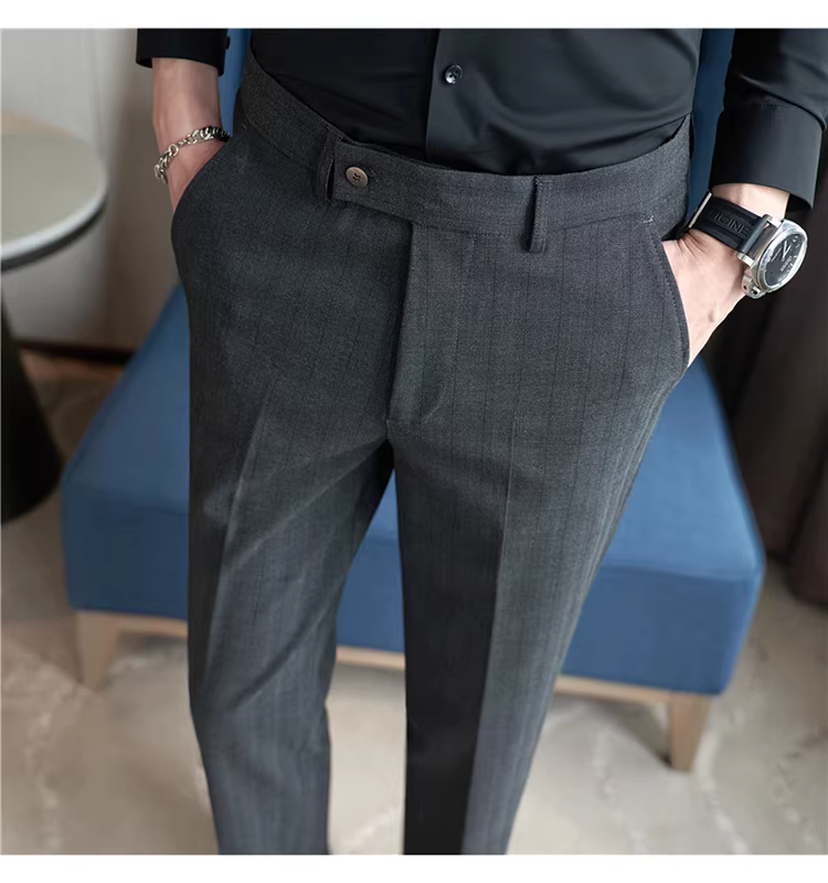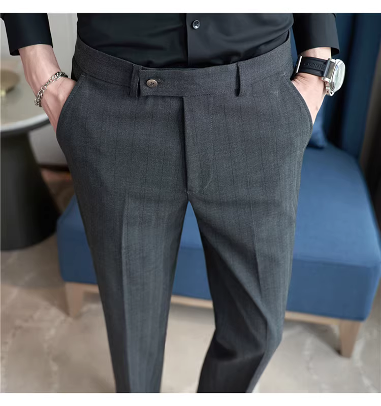 - Quần tây nam sọc vân, kiểu xuân thu mới, phong cách công sở lịch lãm cao cấp Hàn Quốc, dáng ôm thời trang, kiểu dáng thon gọn.