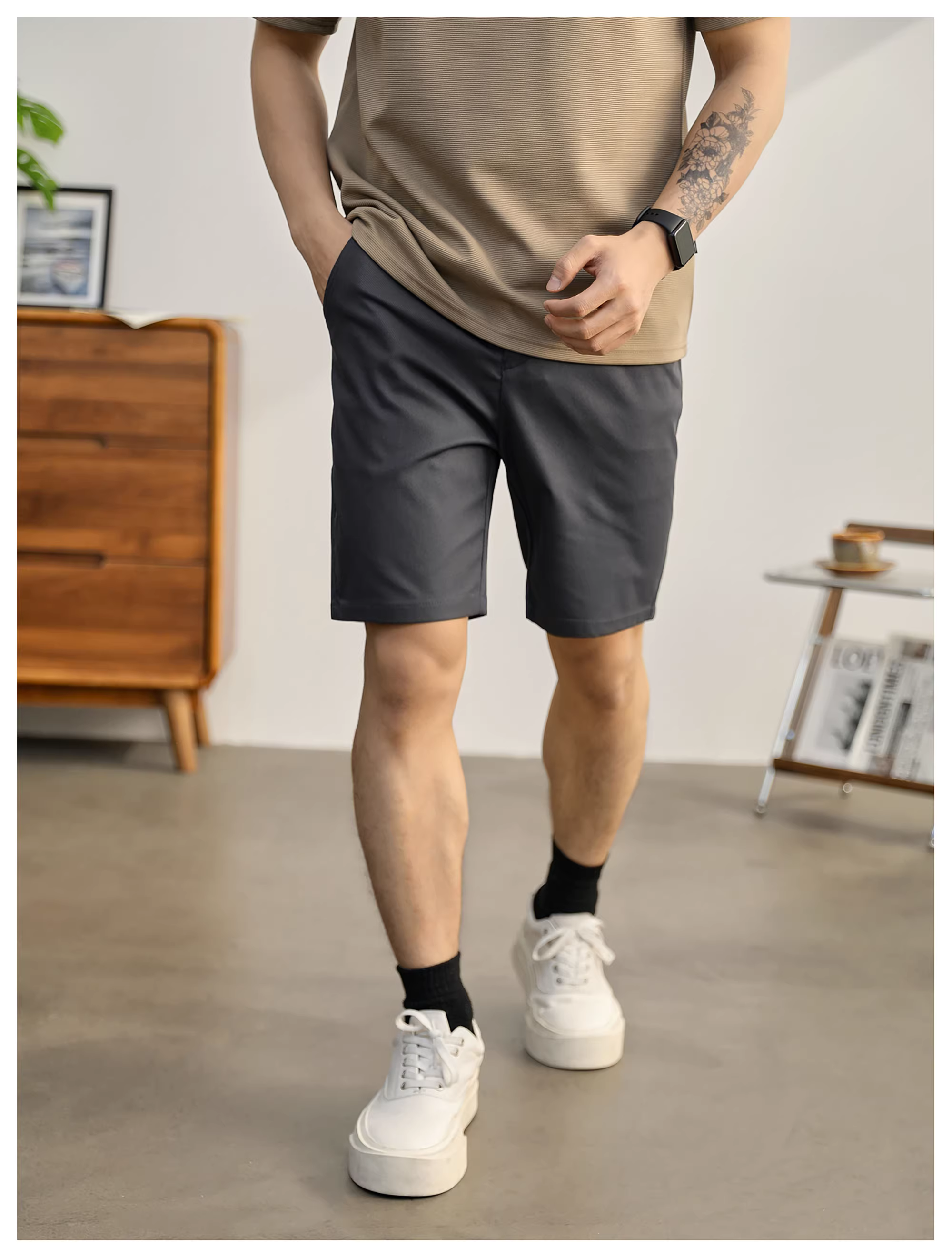 Quần tây ống đứng màu xám LUUD dành cho nam, quần short lưng thun nửa co giãn mát mẻ mùa hè với đường may ba chiều.