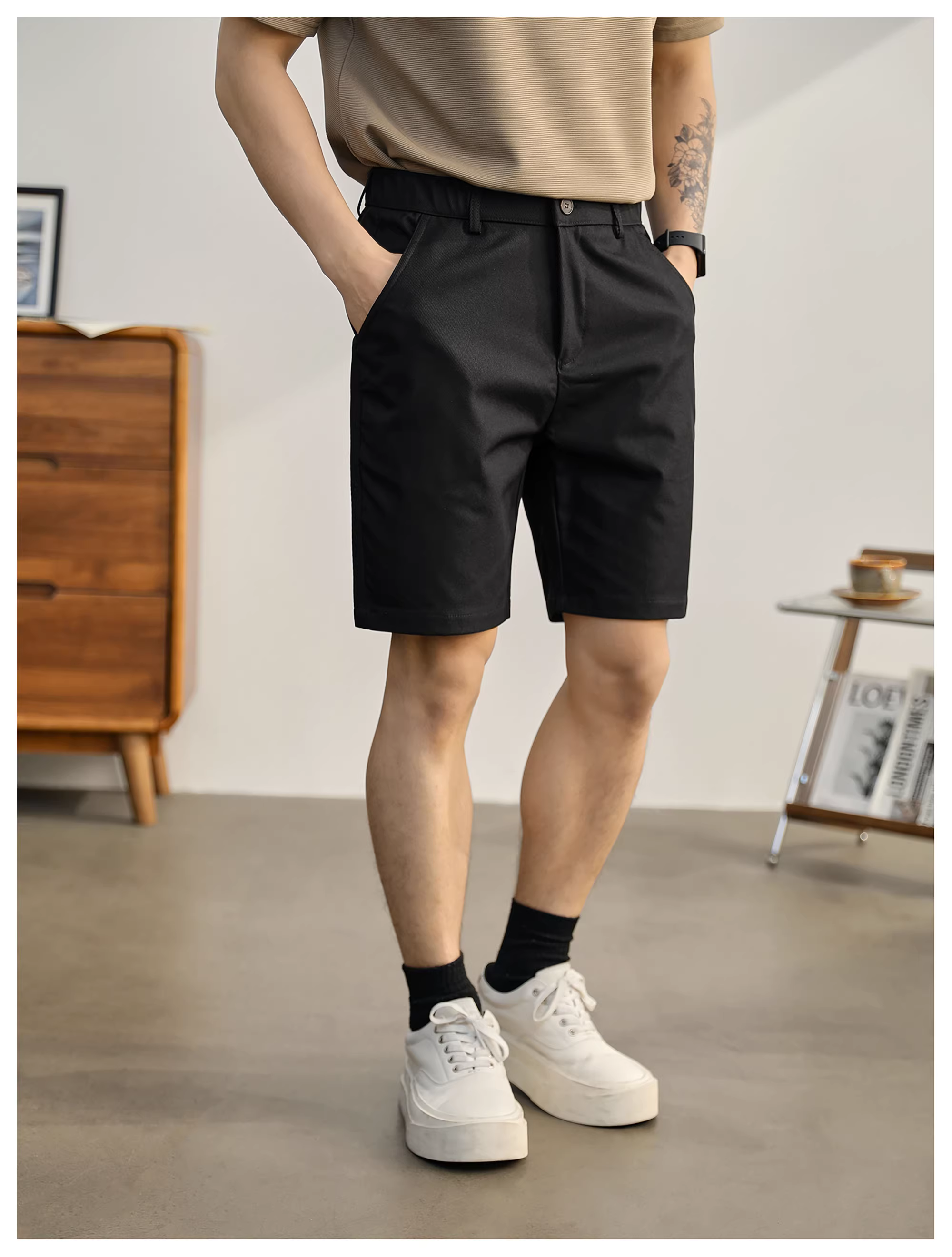 - Quần tây ống đứng màu xám LUUD dành cho nam, quần short lưng thun nửa co giãn mát mẻ mùa hè với đường may ba chiều.