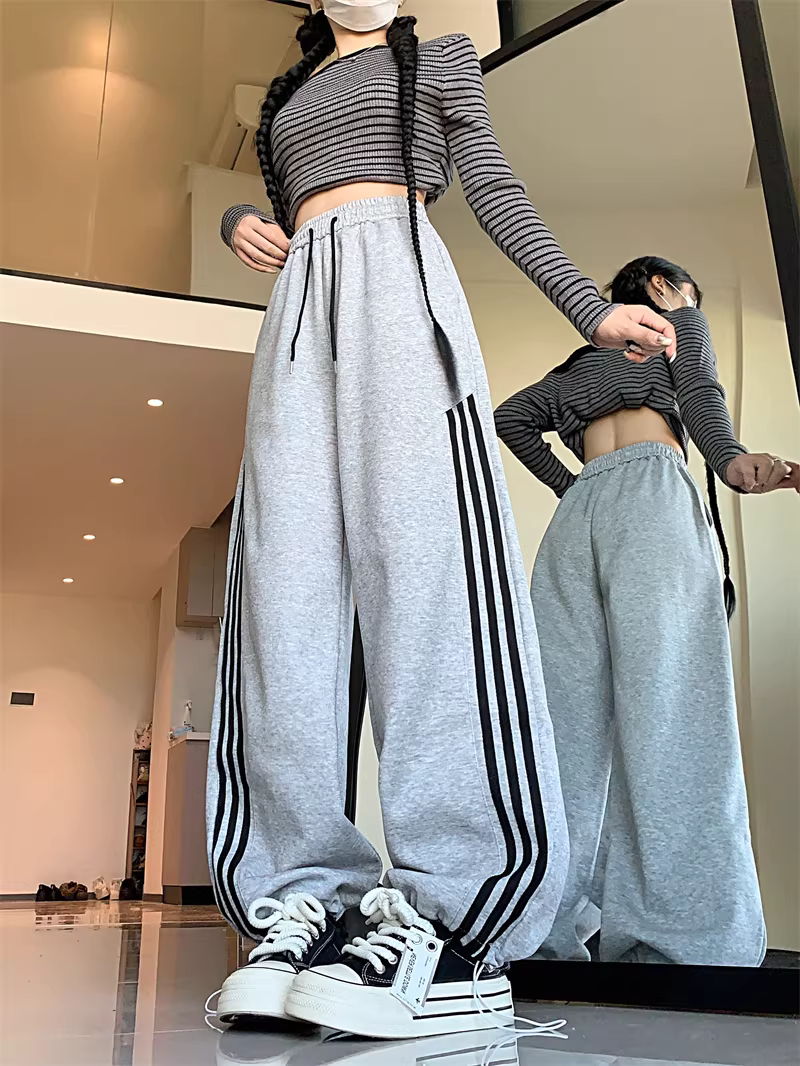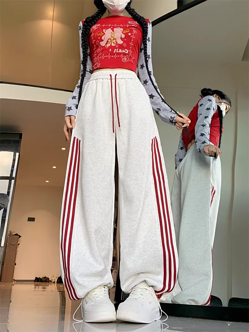 Quần thể thao màu đỏ dành cho nữ, mùa xuân thu, quần ba sọc, dáng rộng, phong cách BF, quần đi bộ thông thường, quần ống rộng, quần thể thao mặc hai chiều.