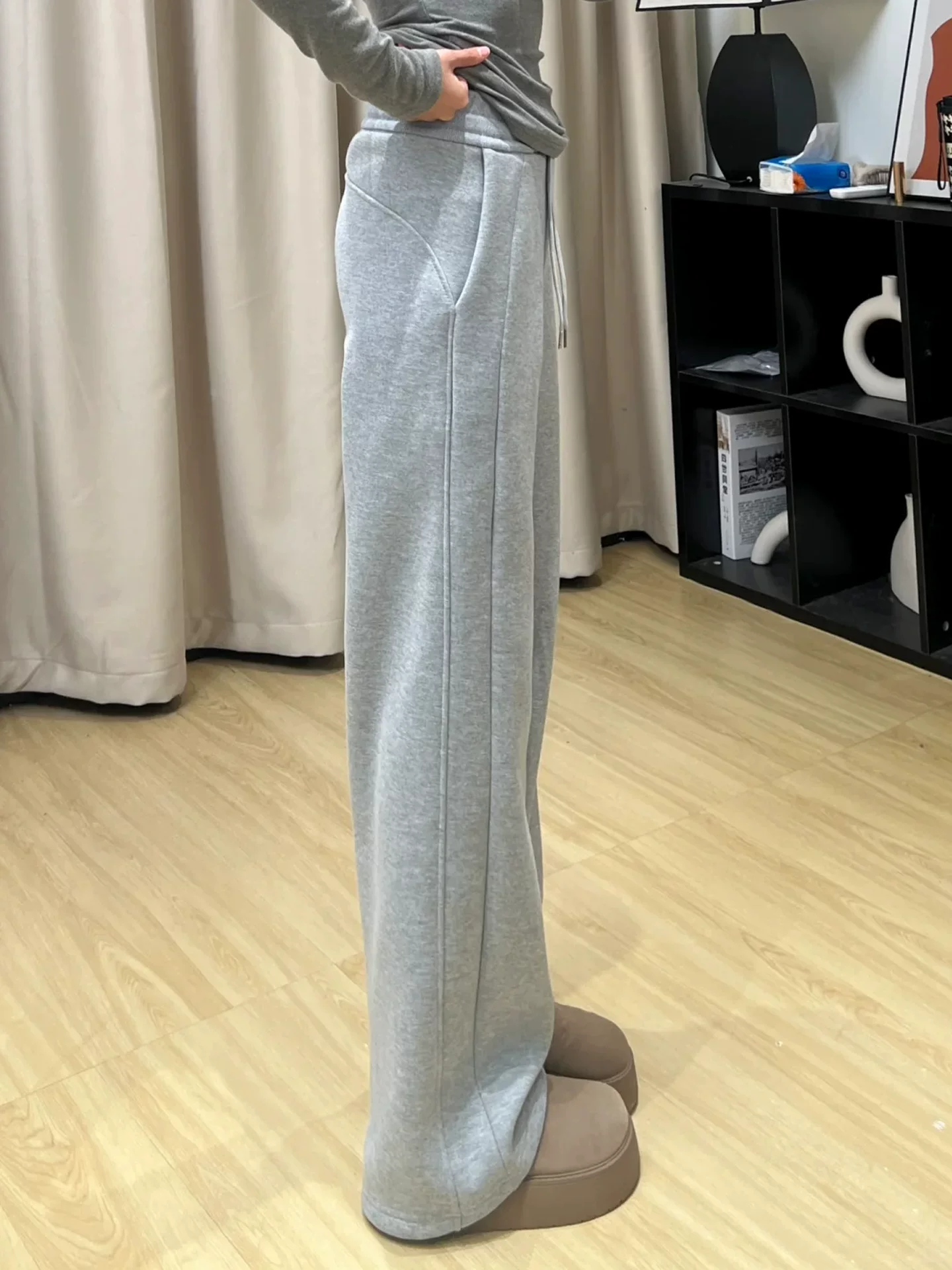 Quần thể thao màu xám carbon dành cho nữ, mùa thu đông, cỡ lớn, cạp cao, quần ống rộng dáng thẳng, quần dài dáng rộng, thoải mái.