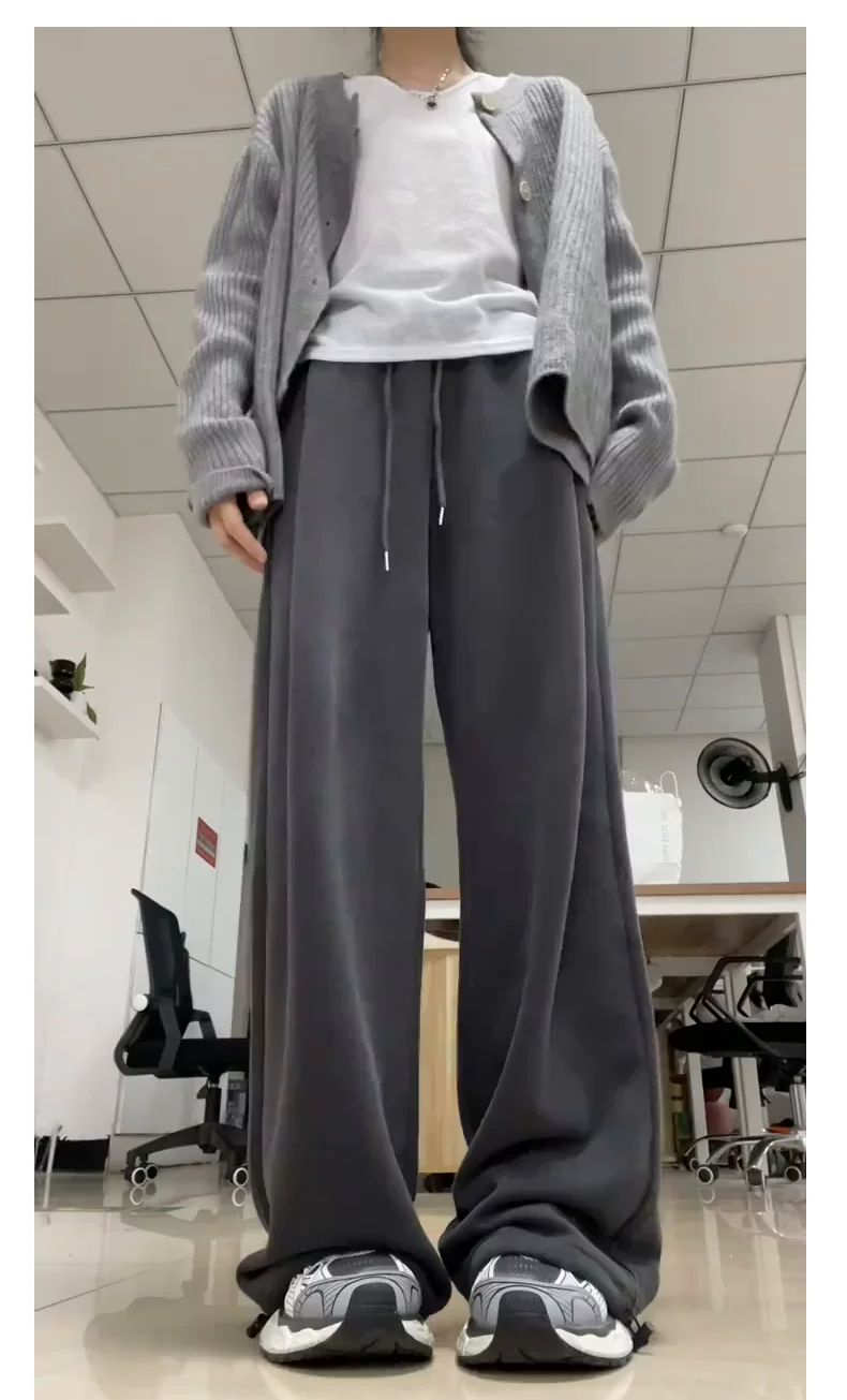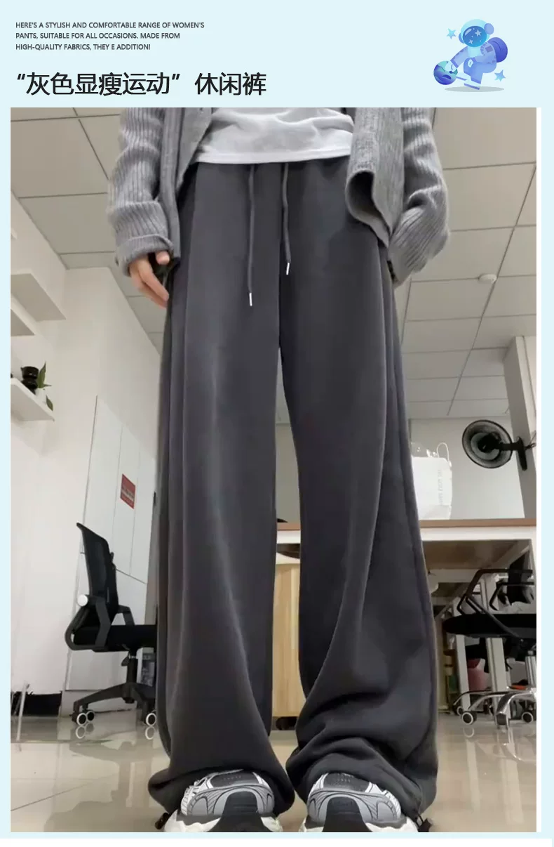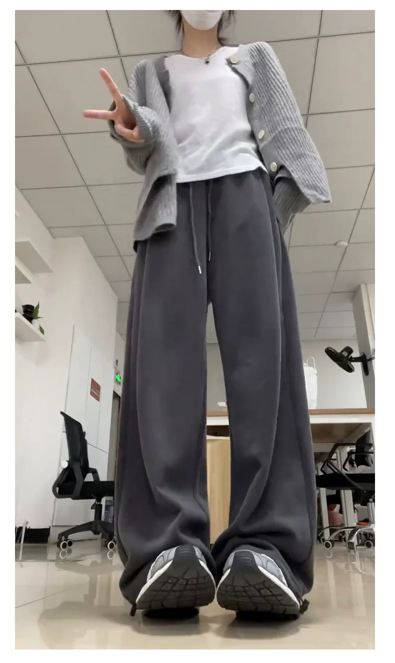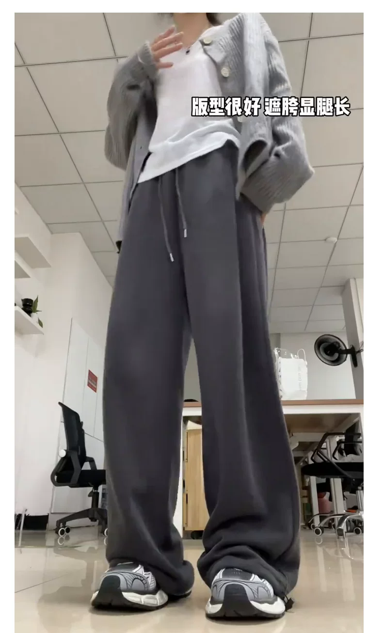 - Quần thể thao màu xám đậm dành cho nữ, mùa thu 2025, cỡ lớn, lưng cao, dáng rộng, tôn dáng, dành cho người có thân hình quả lê, quần thường ngày.