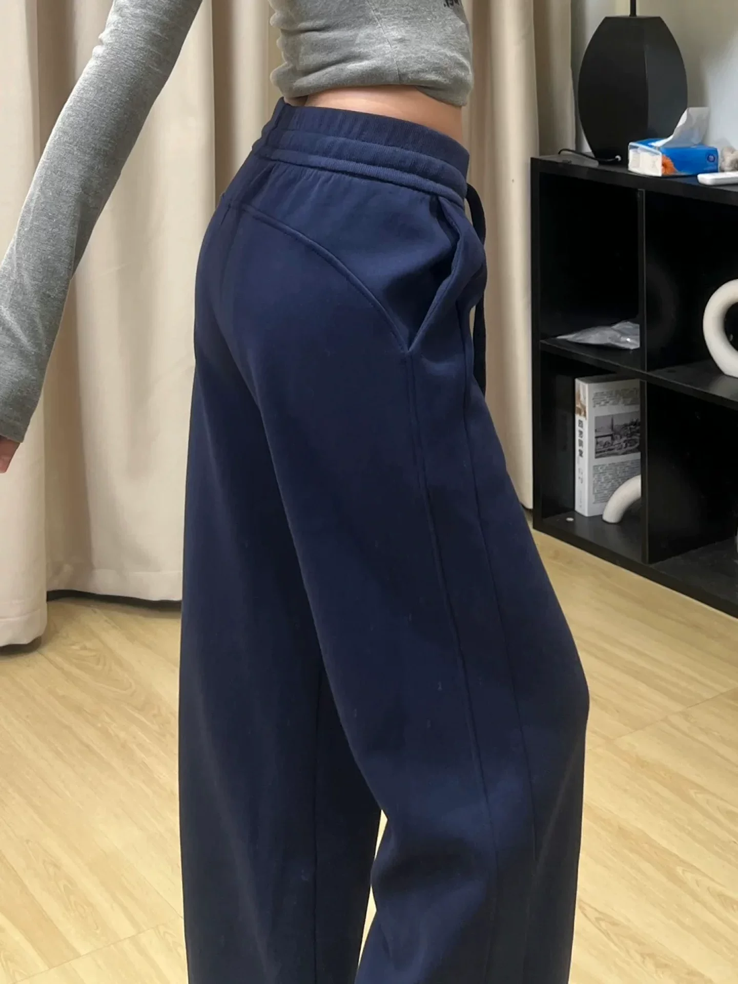 Quần thể thao màu xám dành cho nữ, mùa thu, cỡ lớn, lưng cao, dáng rộng, che hông, giảm béo, dáng quả lê, quần thể thao ống rộng
