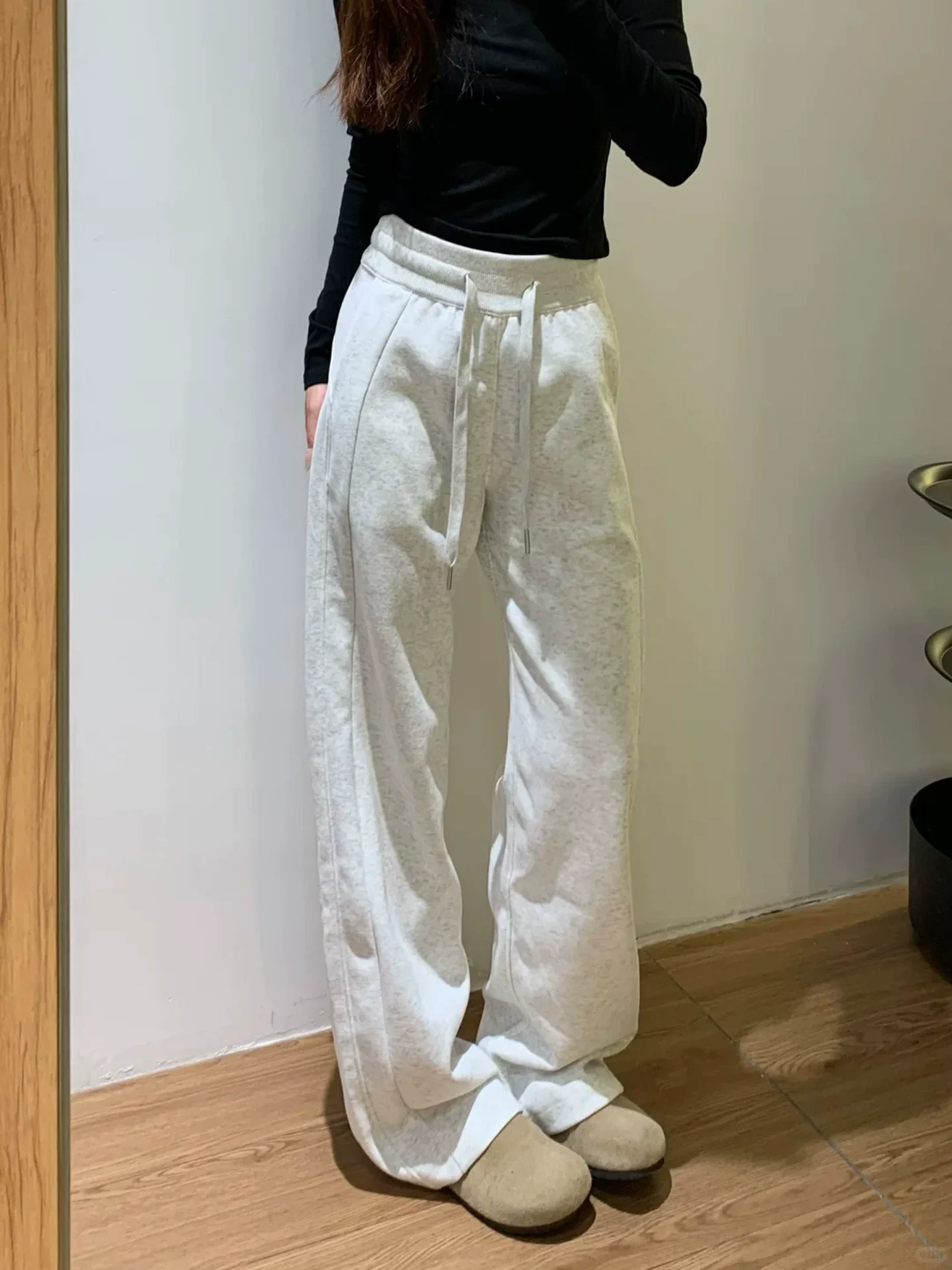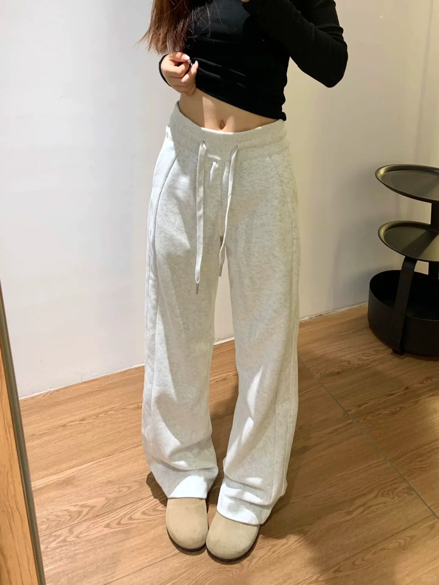 - Quần thể thao nữ màu xám nhạt, kiểu dáng mới mùa thu 2025, size lớn, cạp cao, rộng rãi, tôn dáng, quần ống rộng.