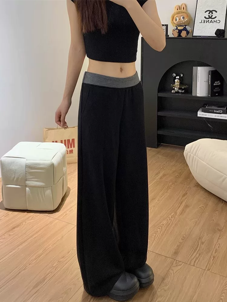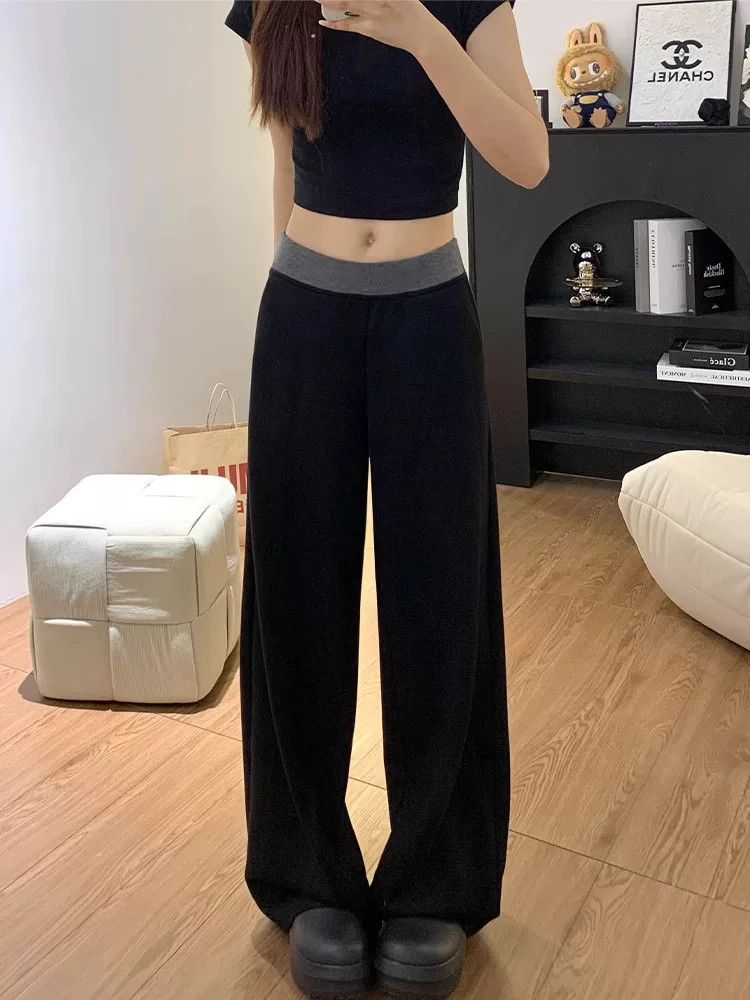 Quần thể thao nữ mùa thu 2024 kiểu mới, size lớn, plus size, cạp cao, dáng rộng, tôn dáng, phối màu, ống rộng